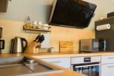 Großzügiger Wohn-Essbereich mit hochwertiger, voll ausgestattete Küche mit Kühl-/Gefrierschrank, Backofen, grosses Induktionskochfeld mit Kindersicherung, Filterkaffeemaschine, SodaStream inkl. Gaskartusche, Mikrowelle, Spülmaschine und modernen Markengeräten.