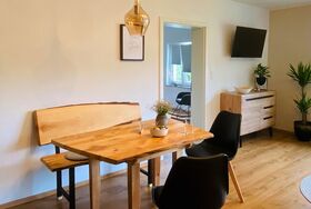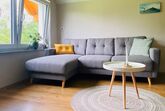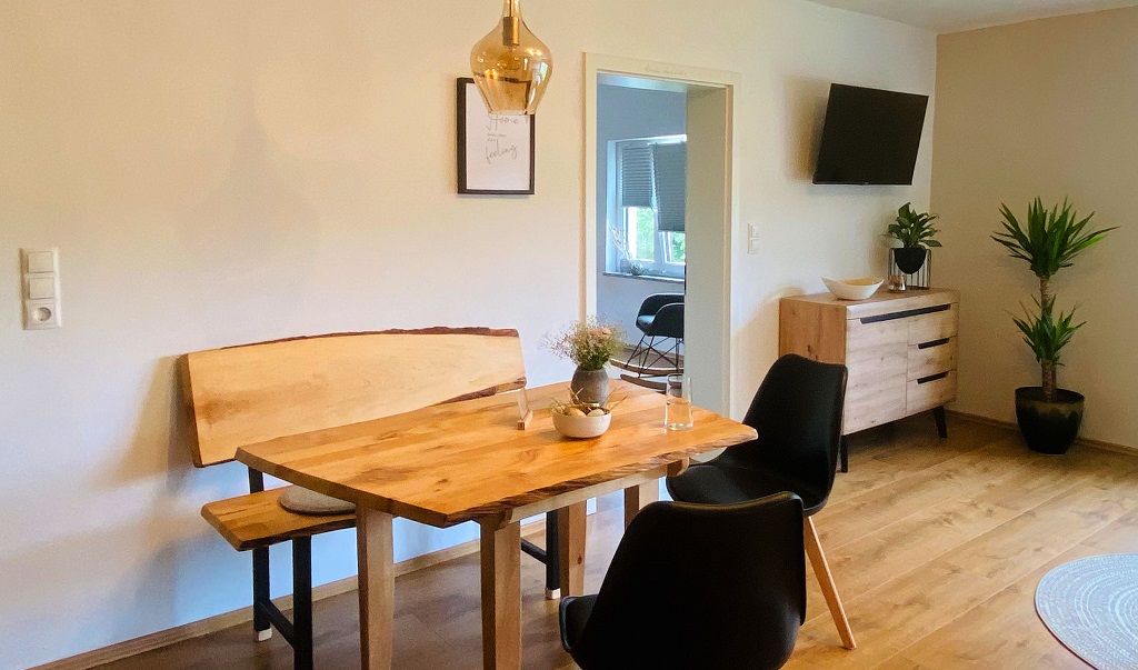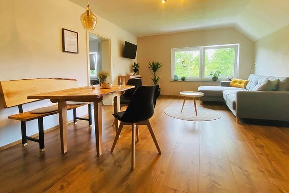 Die moderne 5-Sterne Ferienwohnung bietet einen großen und gemütlichen Wohn- /Essbereich. Genießt den herrlichen Rundumblick aus den großen Fenstern oder dem geräumigen Balkon.