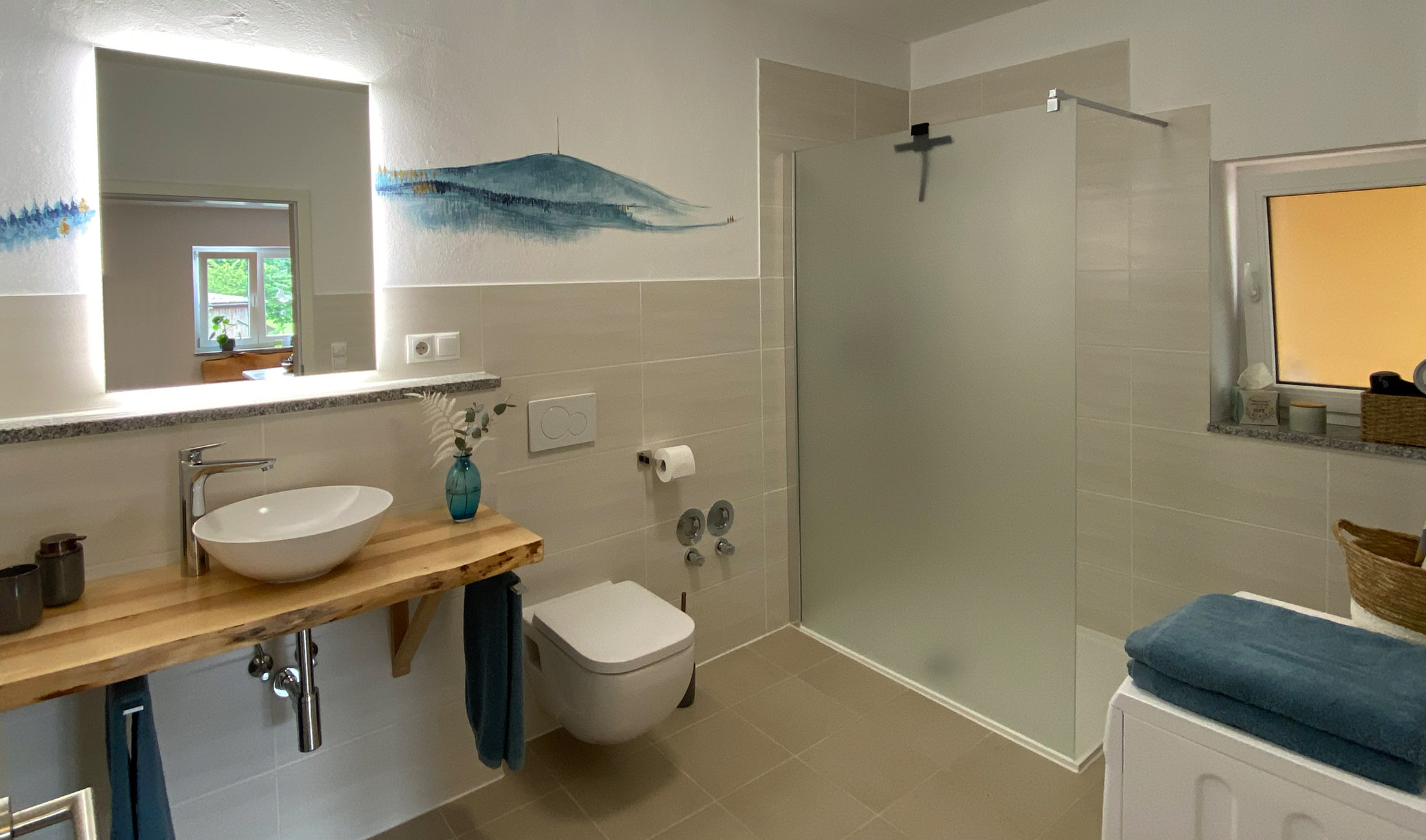 * Großzügiges Bad mit Walk-In-Dusche, Handtuchwärmer und Föhn