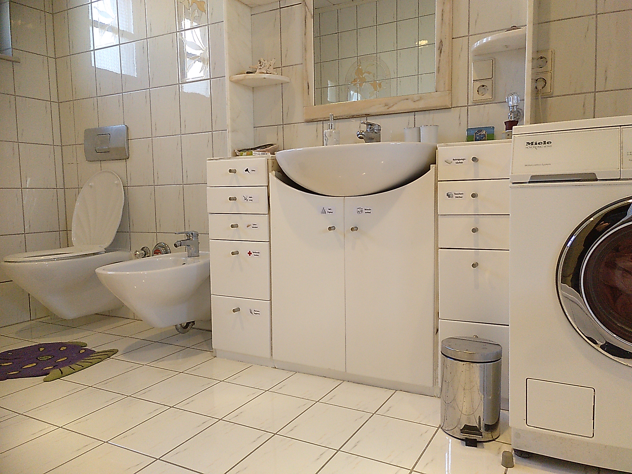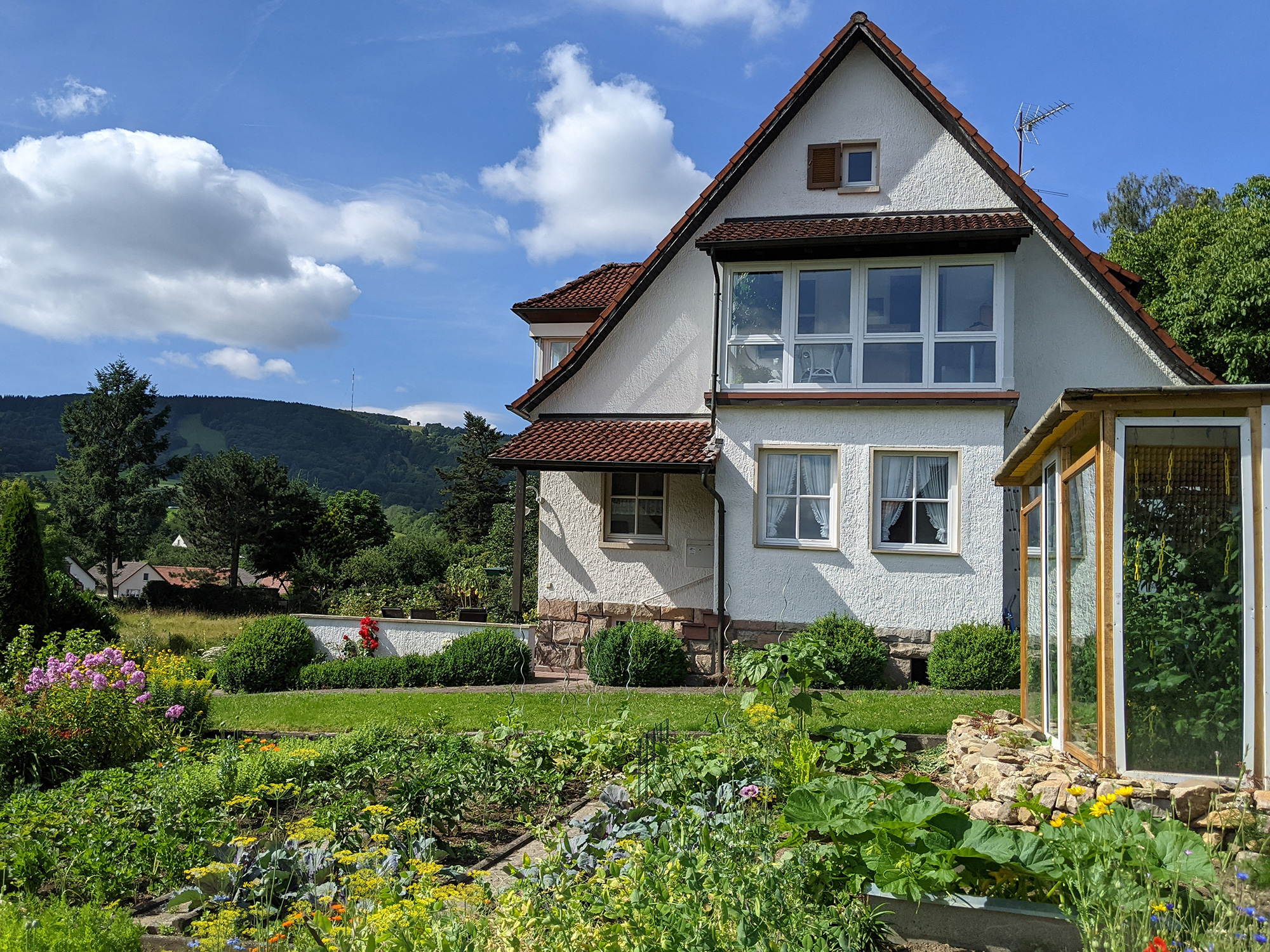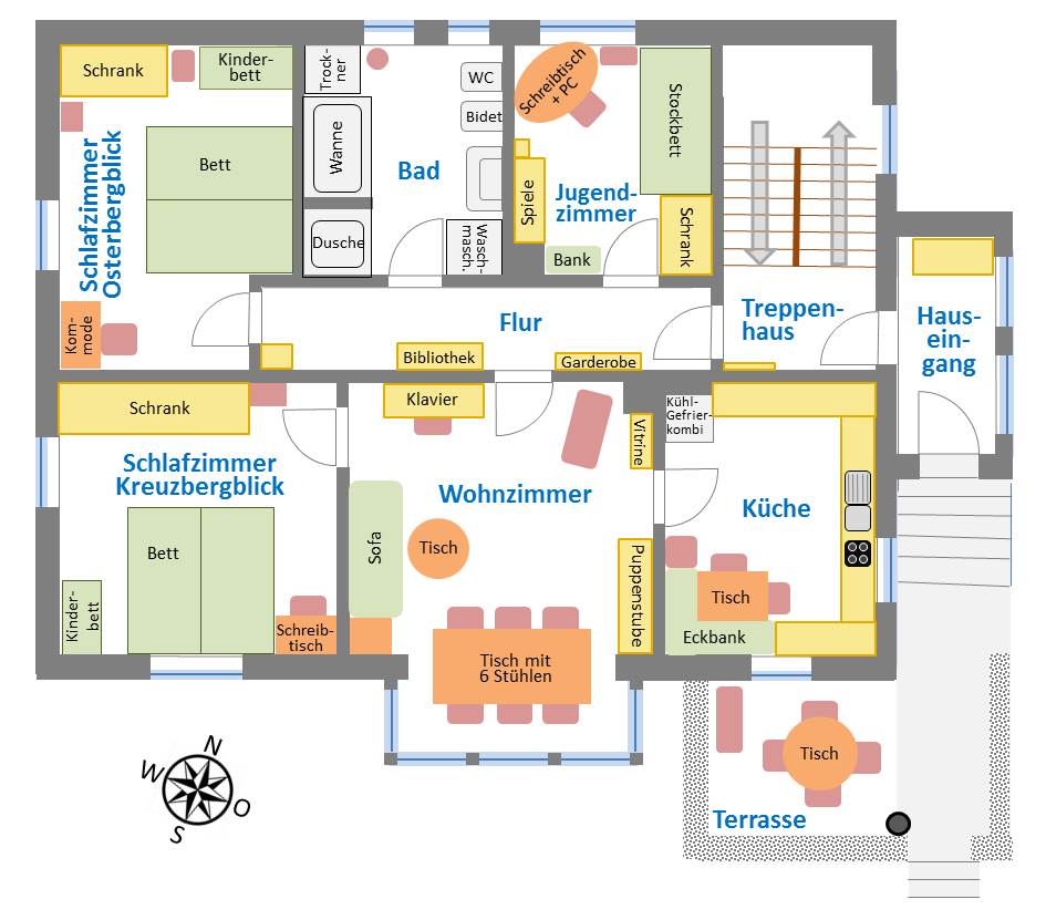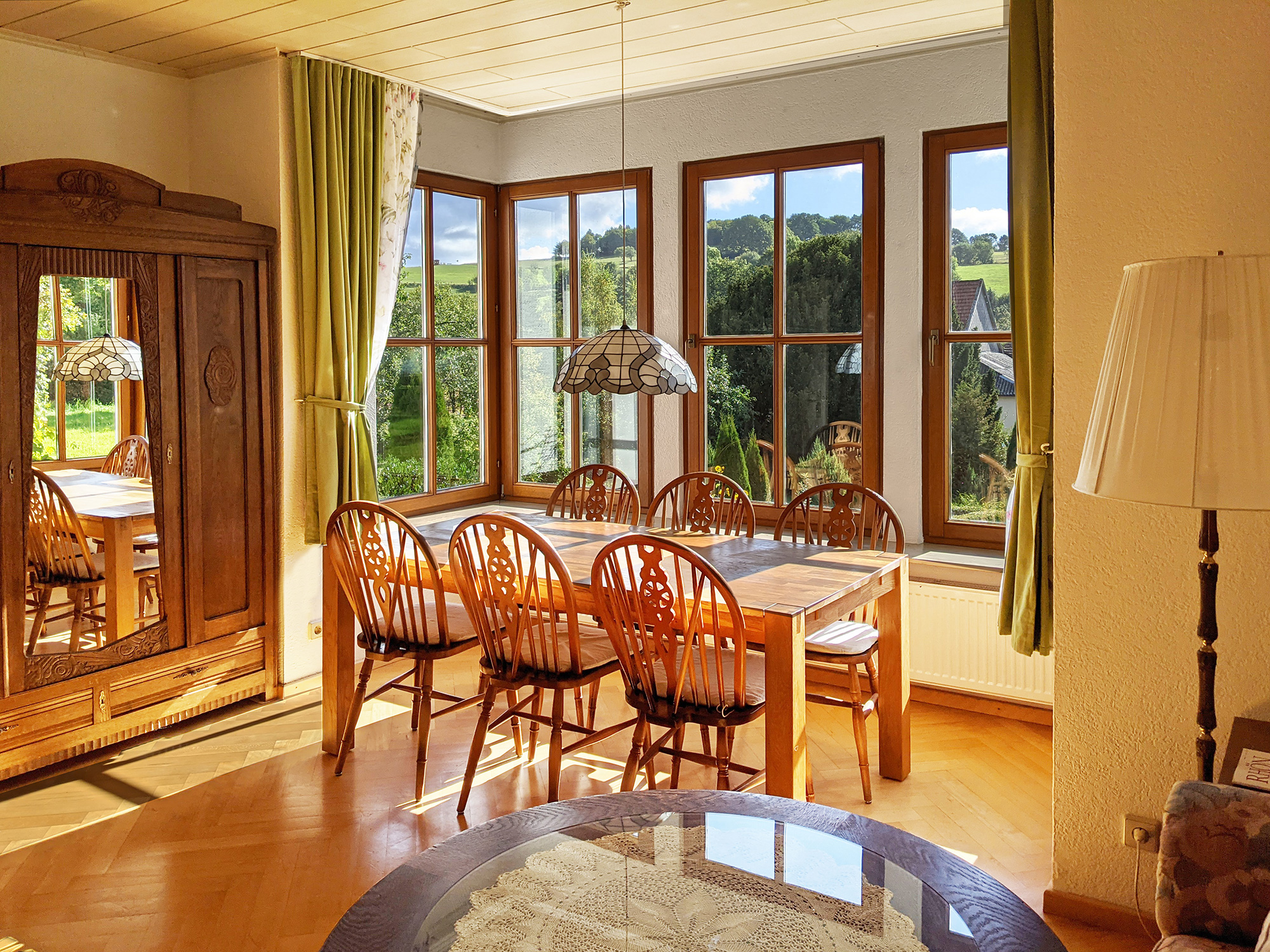 Die liebevoll eingerichtete Ferienwohnung befindet sich im Erdgeschoss einer im Grünen gelegenen Villa und bietet auf 90 Quadratmetern Platz für bis zu 8 Personen. Sie verfügt über zwei gemütlich eingerichtete Schlafzimmer, jeweils mit einem Doppelbett und einem süßen Kinder-Spiel-Bettchen, sowie über ein weiteres Zimmer mit einem Stockbett. Die sehr geräumige Designer-Küche ist mit Ceran-Kochfeld, Backofen, Mikrowelle, Toaster, Sandwich-Maker, Spülmaschine, Kaffemaschine, Wasser- und Eier-Kocher, Kühl-Gefrier-Kombi-Gerät, Waffeleisen, Popcorn Maker, Pürierstab und Mixer bestens ausgestattet. Ein paar Kochbücher und eine Vielfalt an vorhandenen Küchengerätschaften sollen Ihre kulinarische Kreativität anregen. In der Küche finden Sie auch eine Essecke mit Tisch, Stühlen, Eckbank und einer wunderschönen Aussicht ins Grüne. Vom Wohnzimmer aus haben Sie einen großartigen unverbauten Panoramablick auf den Kreuzberg. Es enthält einen großen Esstisch für bis zu 8 Personen, der sogar noch vergrößert werden kann, ein Sofa, einen Schaukelstuhl und ein Klavier sowie einen SAT-Fernseher mit Internetzugang. Ein Spieleschrank mit einer alten Puppenküche, vielen Kinderbüchern sowie Spiel-, Mal- und Bastelsachen sorgen dafür, dass sich Kinder auch bei schlechtem Wetter gut beschäftigen können. In einer kleinen Hausbibliothek finden Sie die unterschiedlichsten Bücher in verschiedenen Sprachen und eine große Sammlung Brettspiele. Das geräumige Badezimmer verfügt über Badewanne, Dusche, WC, Bidet, Wickelauflage, Waschmaschine, Wäschetrockner und Wäscheständer, Föhn, Bügeleisen, Bügelbrett, Staubsauger und ist mit großen Spiegeln ausgestattet. Bei schönem Wetter können Sie auf der sonnigen Veranda sitzen; die Kinder können im Garten spielen oder bei Gartenarbeiten mithelfen.