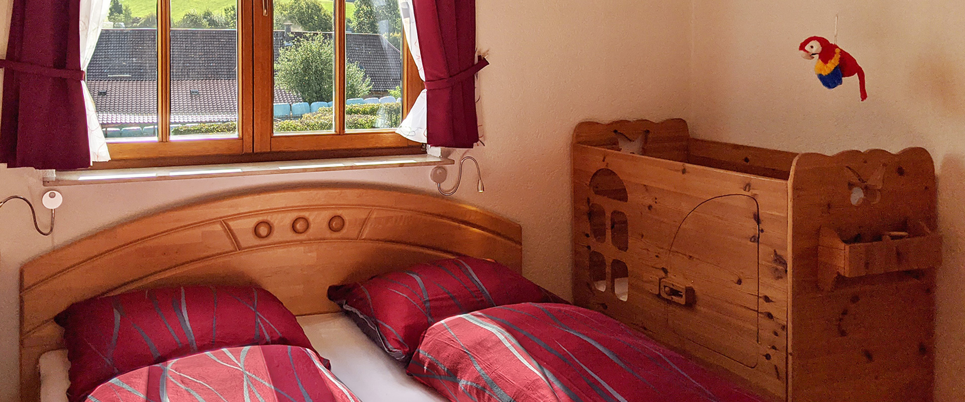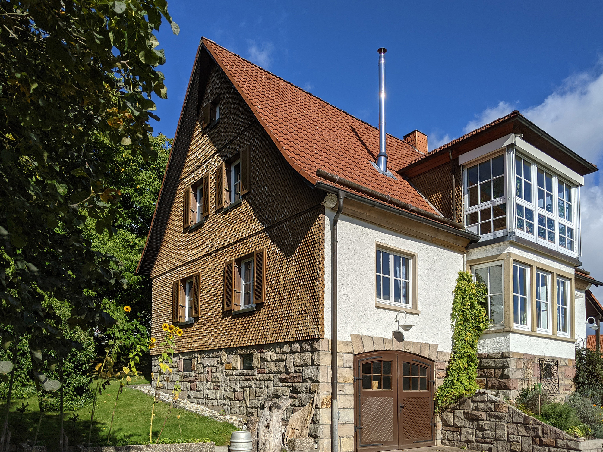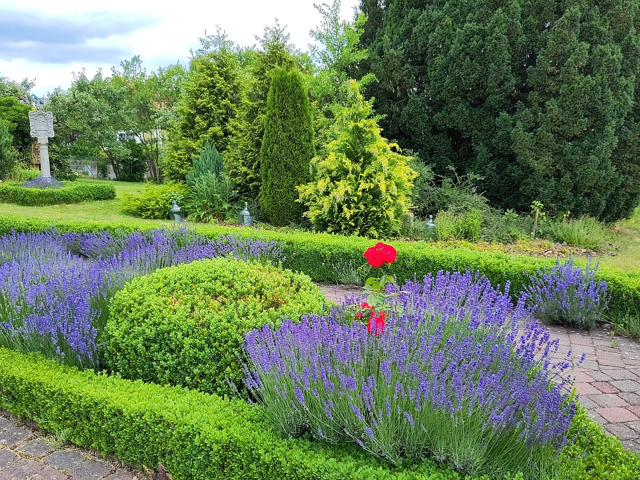 Die liebevoll eingerichtete Ferienwohnung befindet sich im Erdgeschoss einer im Grünen gelegenen Villa und bietet auf 90 Quadratmetern Platz für bis zu 8 Personen. Sie verfügt über zwei gemütlich eingerichtete Schlafzimmer, jeweils mit einem Doppelbett und einem süßen Kinder-Spiel-Bettchen, sowie über ein weiteres Zimmer mit einem Stockbett. Die sehr geräumige Designer-Küche ist mit Ceran-Kochfeld, Backofen, Mikrowelle, Toaster, Sandwich-Maker, Spülmaschine, Kaffemaschine, Wasser- und Eier-Kocher, Kühl-Gefrier-Kombi-Gerät, Waffeleisen, Popcorn Maker, Pürierstab und Mixer bestens ausgestattet. Ein paar Kochbücher und eine Vielfalt an vorhandenen Küchengerätschaften sollen Ihre kulinarische Kreativität anregen. In der Küche finden Sie auch eine Essecke mit Tisch, Stühlen, Eckbank und einer wunderschönen Aussicht ins Grüne. Vom Wohnzimmer aus haben Sie einen großartigen unverbauten Panoramablick auf den Kreuzberg. Es enthält einen großen Esstisch für bis zu 8 Personen, der sogar noch vergrößert werden kann, ein Sofa, einen Schaukelstuhl und ein Klavier sowie einen SAT-Fernseher mit Internetzugang. Ein Spieleschrank mit einer alten Puppenküche, vielen Kinderbüchern sowie Spiel-, Mal- und Bastelsachen sorgen dafür, dass sich Kinder auch bei schlechtem Wetter gut beschäftigen können. In einer kleinen Hausbibliothek finden Sie die unterschiedlichsten Bücher in verschiedenen Sprachen und eine große Sammlung Brettspiele. Das geräumige Badezimmer verfügt über Badewanne, Dusche, WC, Bidet, Wickelauflage, Waschmaschine, Wäschetrockner und Wäscheständer, Föhn, Bügeleisen, Bügelbrett, Staubsauger und ist mit großen Spiegeln ausgestattet. Bei schönem Wetter können Sie auf der sonnigen Veranda sitzen; die Kinder können im Garten spielen oder bei Gartenarbeiten mithelfen.