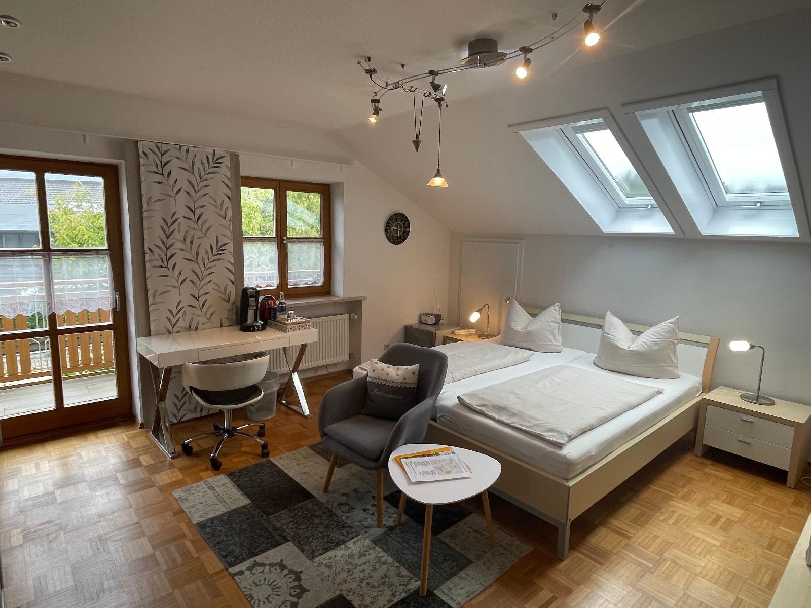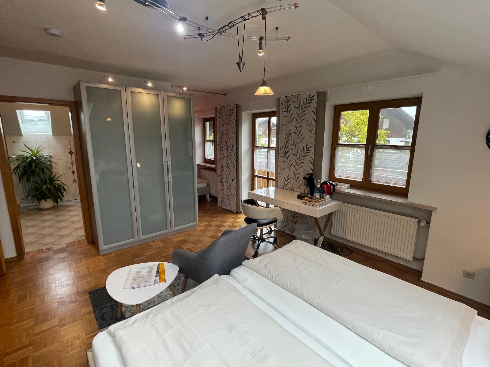 Privatzimmer 35m² für 1-4 Pers., Doppelbett, Queensize Bett (1,40 x 2,0m) als tt, eigenes Badezimmer mit Dusche und WC, SAT-TV, kleiner Kühlschrank, Kaffemaschine im Zimmer,