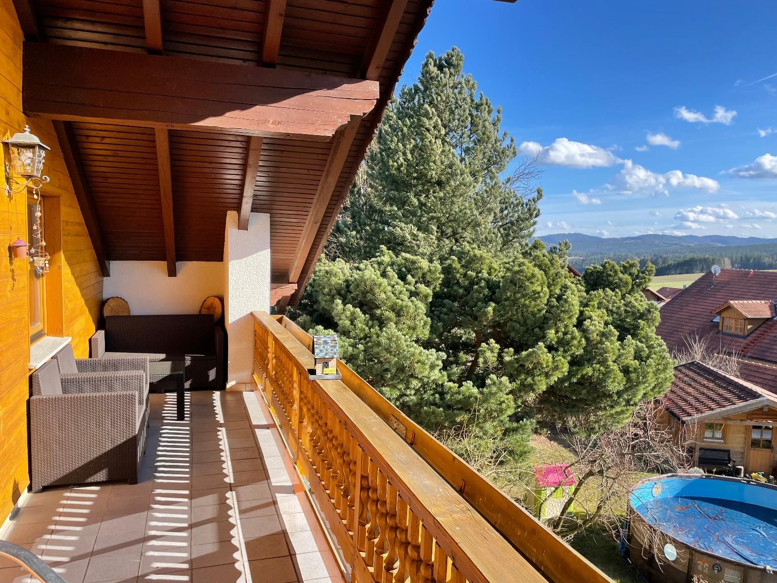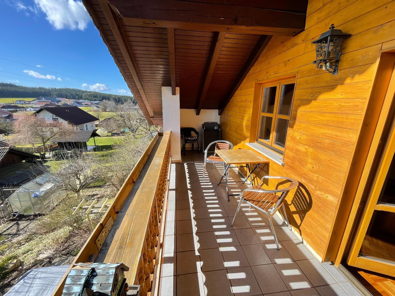 17m² großer überdachter Südbalkon mit Gartenmöbeln und schönem Panoramausblick