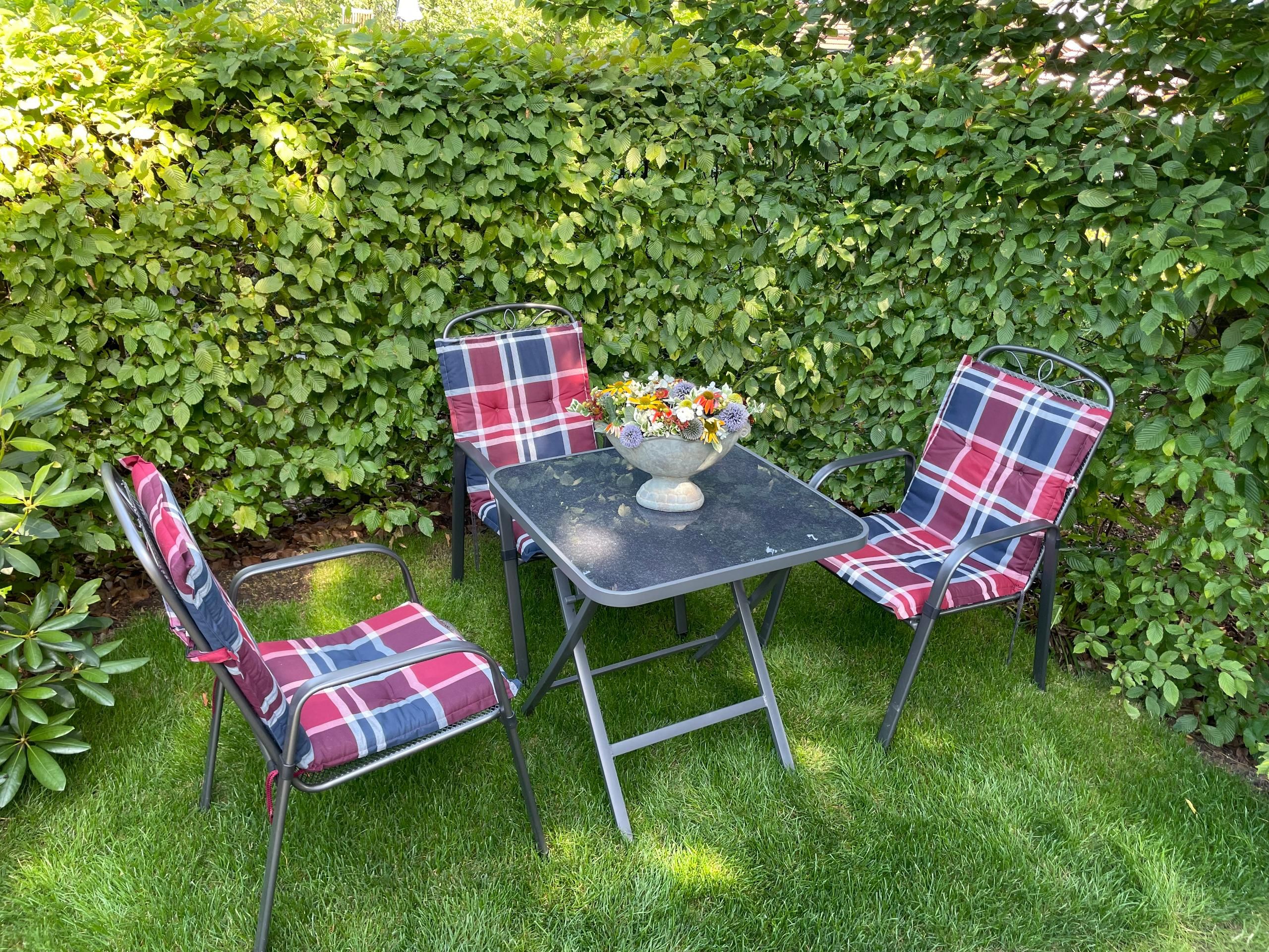 teils überdachter Balkon ca. 9 m² mit Tisch und Stühlen , Aussicht auf Garten