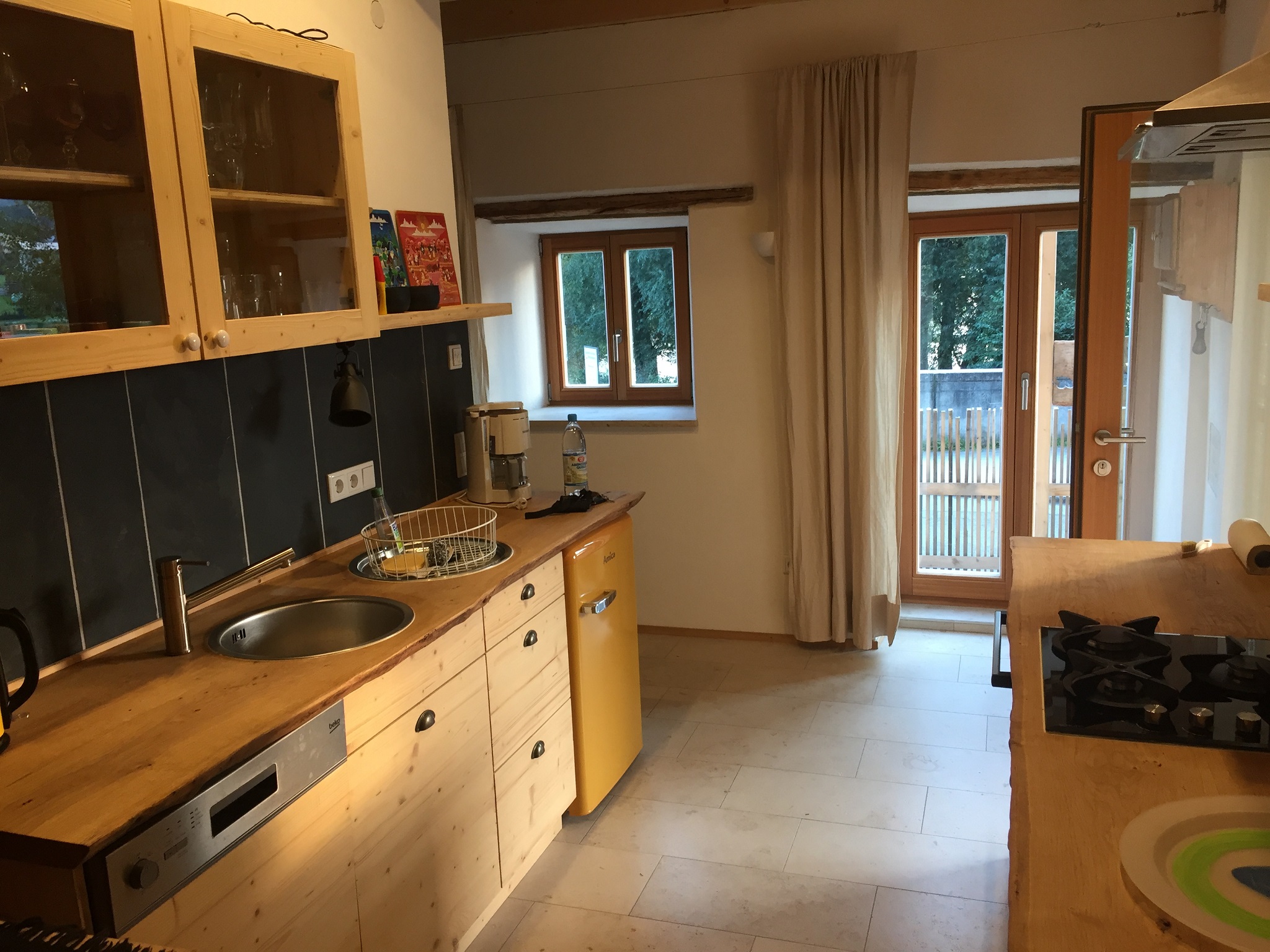 Gasherd, Ofen, Kühlschrank mit Gefrierfach, Filter-Kaffeemaschine, Espressokocher, Toaster, Wasserkocher, Geschirrspülmaschine, Kinderstuhl
