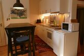 KÜCHE UND ESSBEREICH: Esstisch für 6 Personen. Umfassend und hochwertig ausgestattete Einbauküche mit Herd, Backofen, Kühlschrank mit Kühlfach, Mikrowelle, Caffettiera (Bodum), Toaster, Wasserkocher, Rührgerät, Stabmixer, Waage etc. (keine Geschirrspülmaschine), Geschirrtücher. Babyhochstuhl.