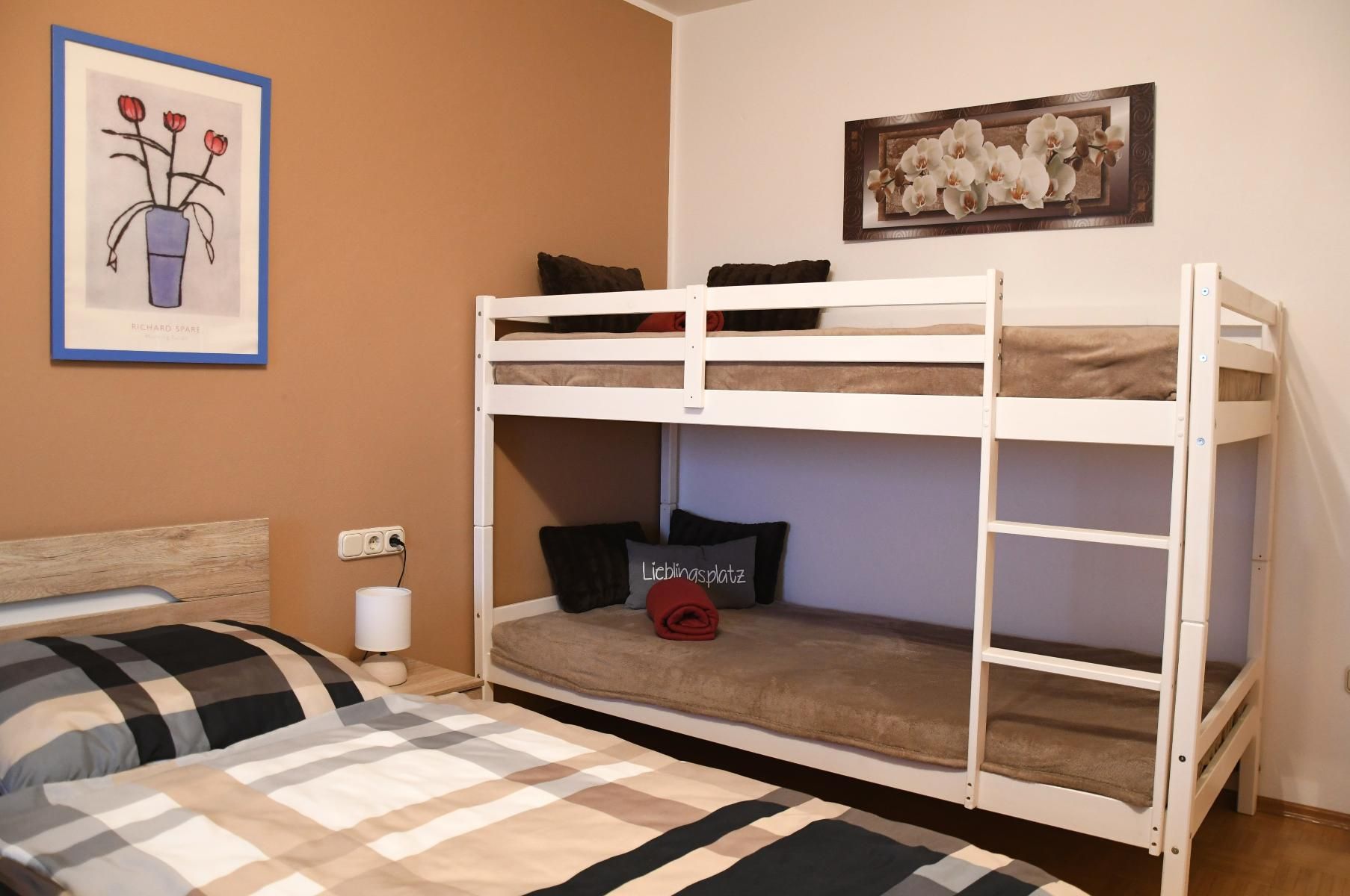 Das Schlafzimmer ist mit einem Doppelbett 180 x 200cm, einem Etagenbett für 2 Personen und einem großen Kleiderschrank ausgestattet.