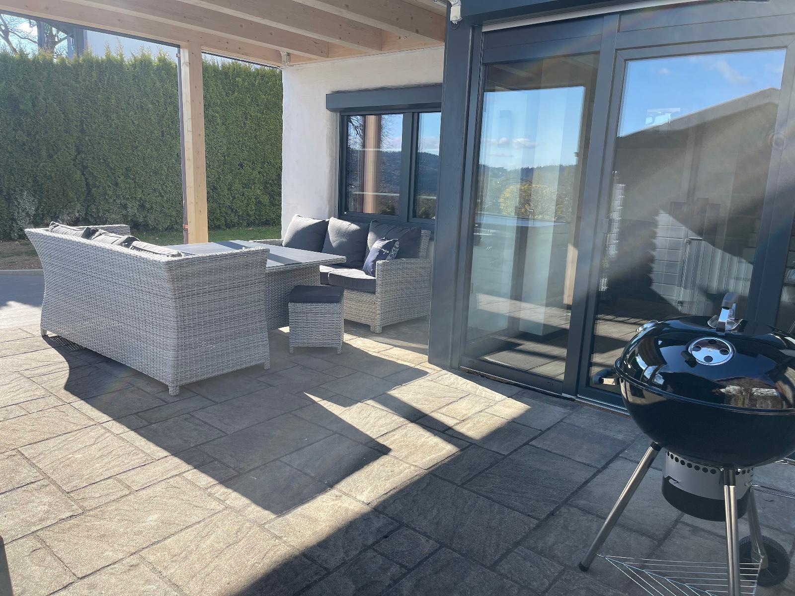 Terrasse mit Lounge-Möbeln, Gartengrill (Holzkohle vorhanden) und