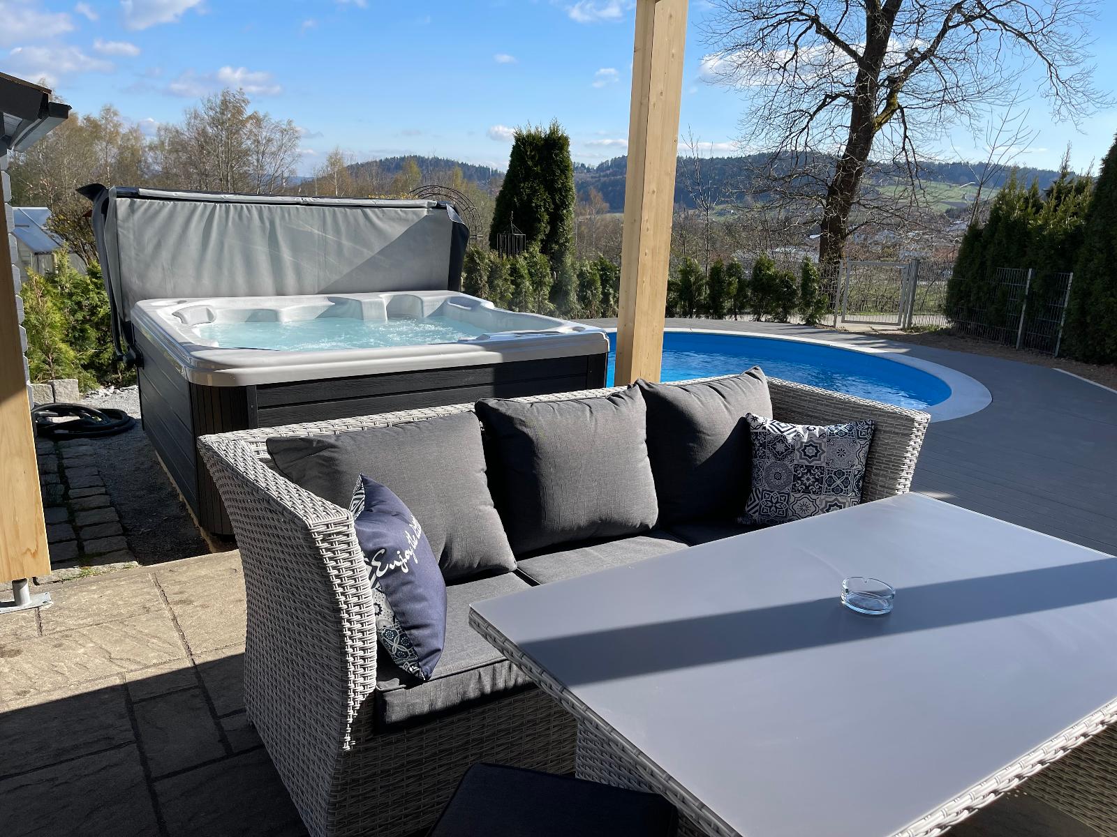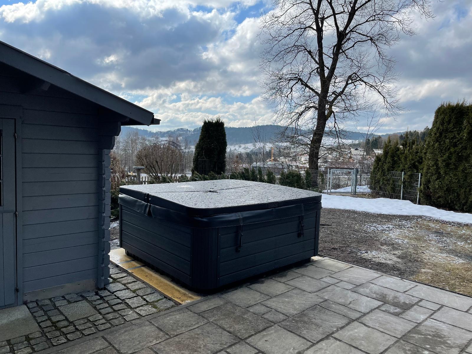 komplett eingezäuntem kleinen Garten mit beheiztem Whirlpool und