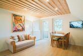 Von der Wohnküche gelangt man direkt auf den kleinen Balkon, der sich inmitten der Natur befindet.