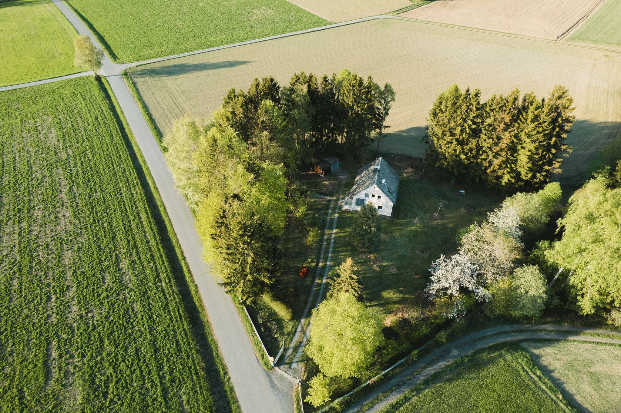 Es ist umgeben von Feldern, Wald und Wiesen.