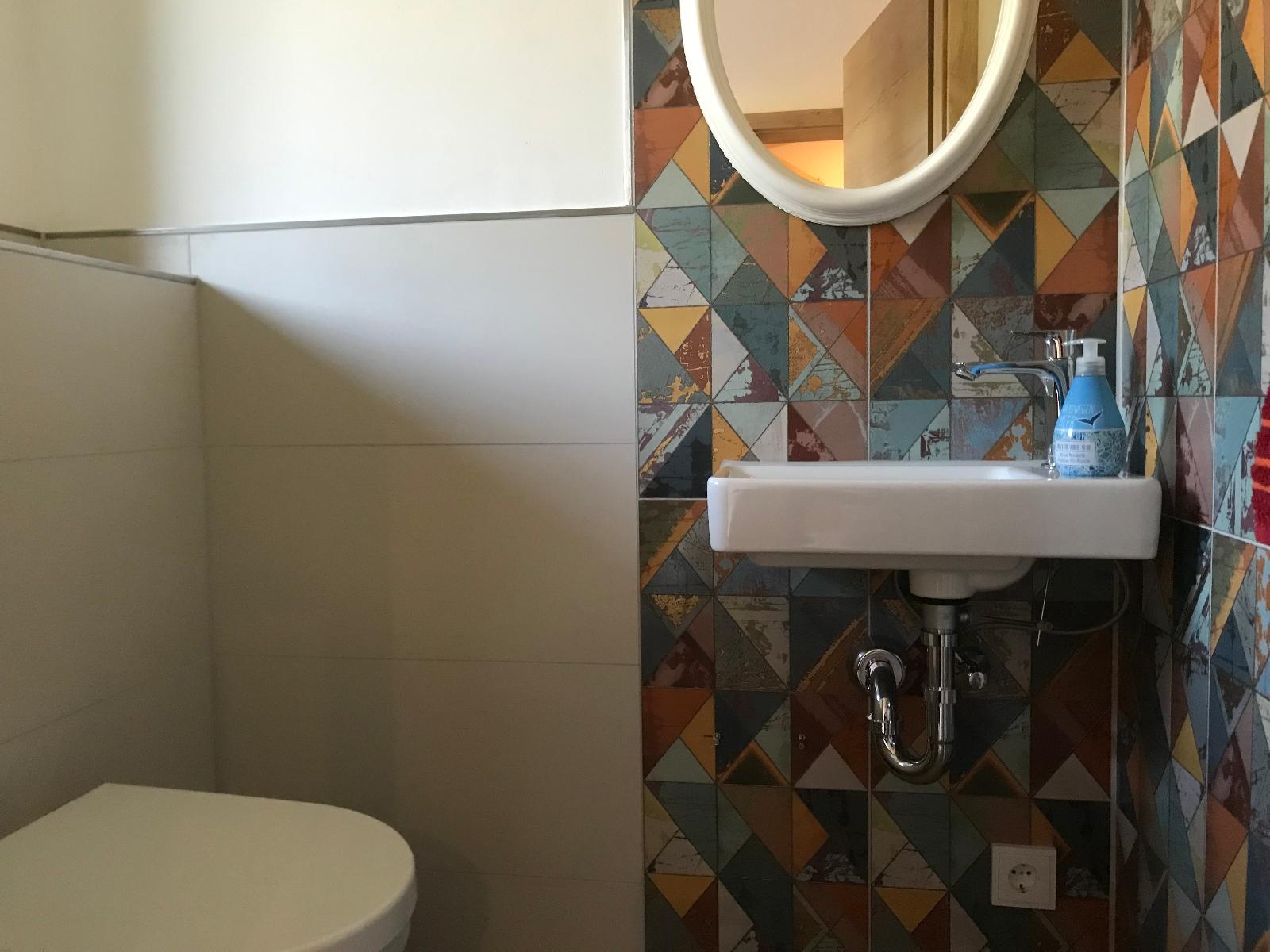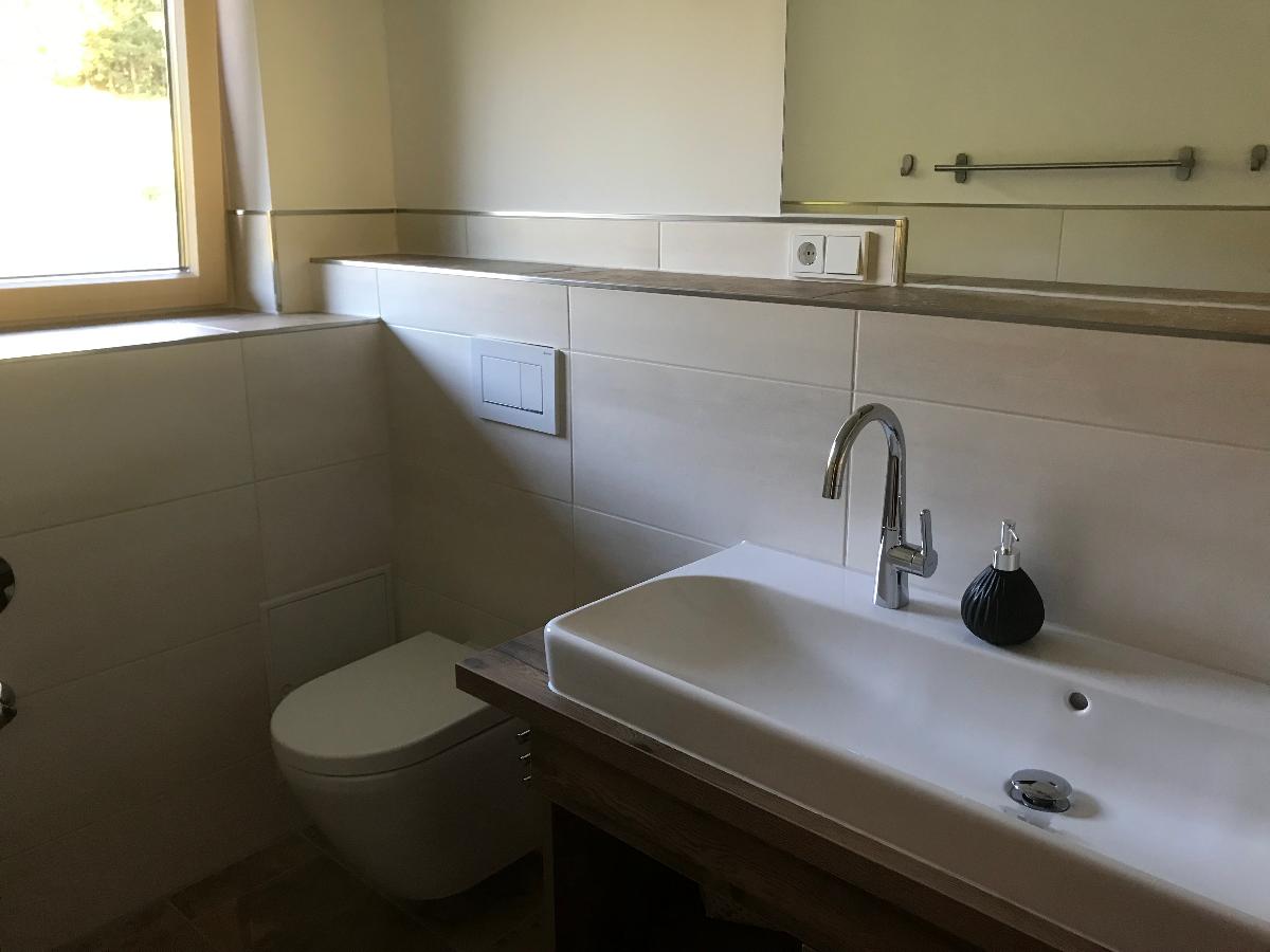Das Bad bietet neben einem Doppelwaschbecken eine bodengleiche, sehr geräumige Dusche mit einer zusätzlichen Regenbrause.