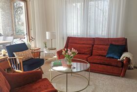 Das Esszimmer ist mit dem Wohnzimmer verbunden, in dem man über eine große Glaswand Blick auf den Garten und Terrasse hat. Besonderes Highlight ist hier der originale Kachelofen, den Sie über bereitgestelltes Holz gerne befeuern dürfen.