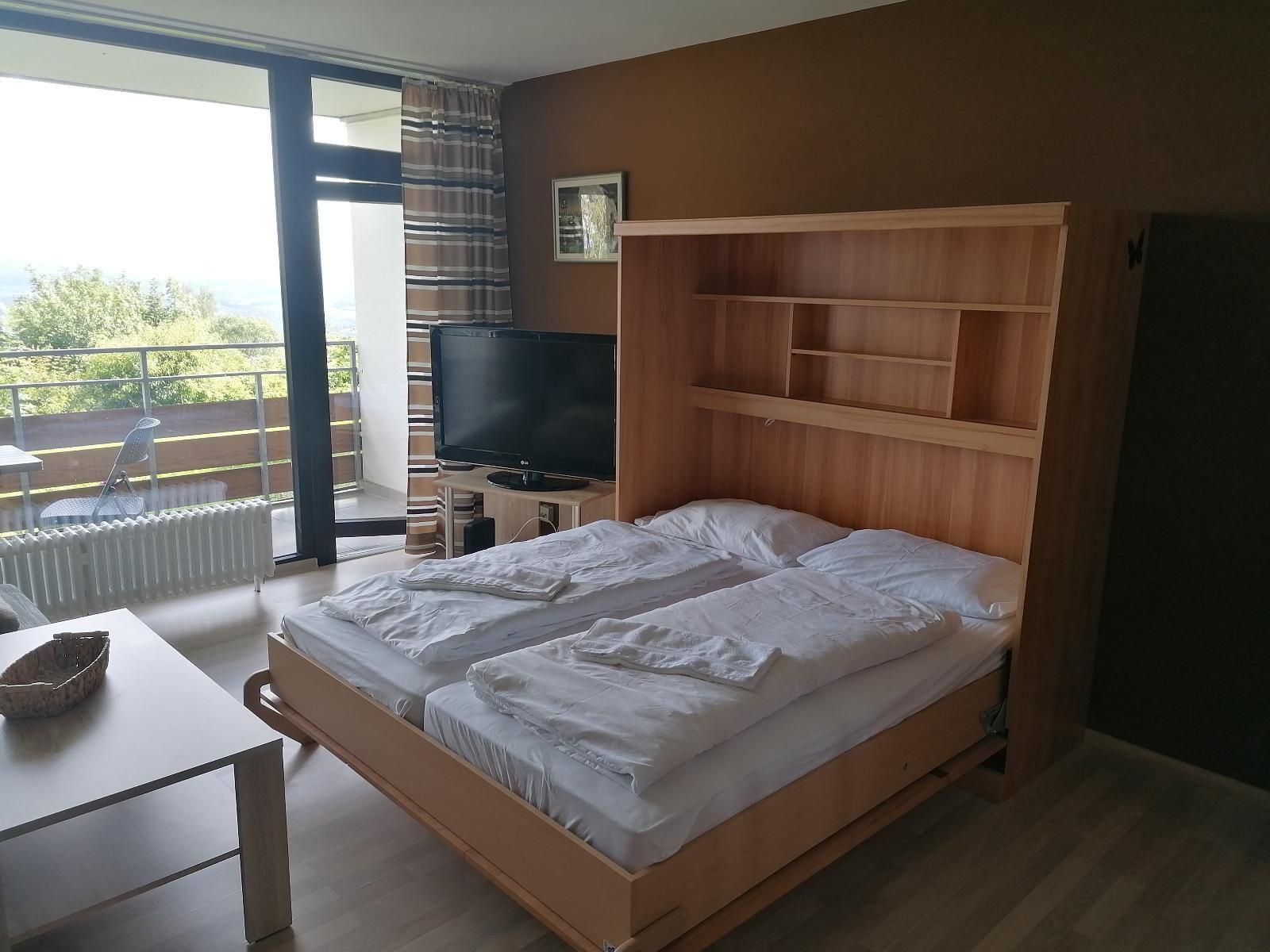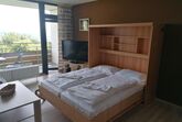 Eine Loggia mit traumhaftem Ausblick, Wohn-/Schlafraum mit Schrankbett, außerhalb des Wohnraumes steht ein Etagenbett für die Kids (70 x 160cm) bereit, Kabel-TV, kostenlos WLAN, Stereo-Kompaktanlage, gemütliche Essecke.