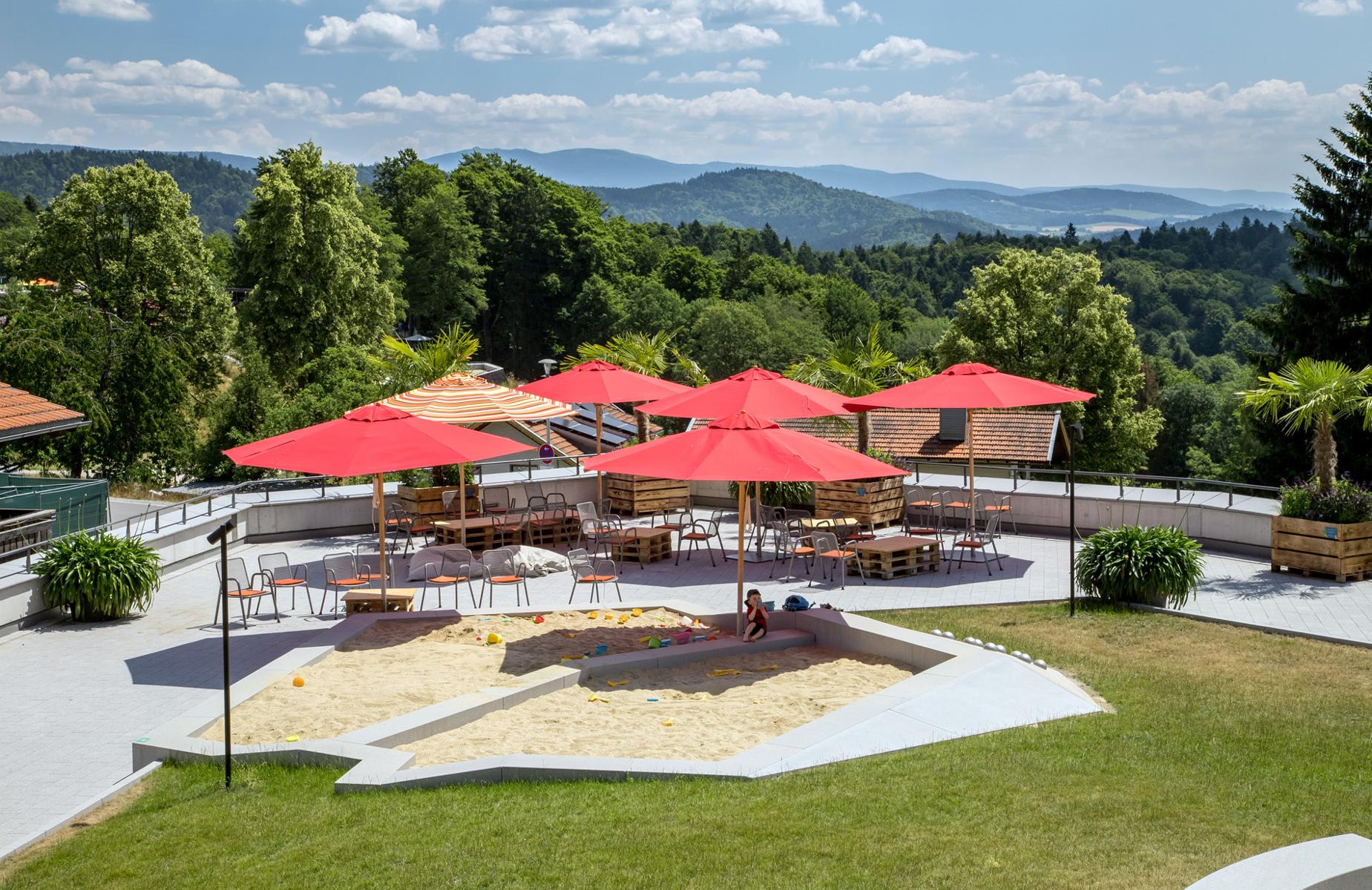 Direkt neben der Ferienanlage befindet sich ein großer Kletterspielplatz mit einzigartiger Kletterwolke und ein Bewegungsparcours. Ideal für Familien mit Kindern.