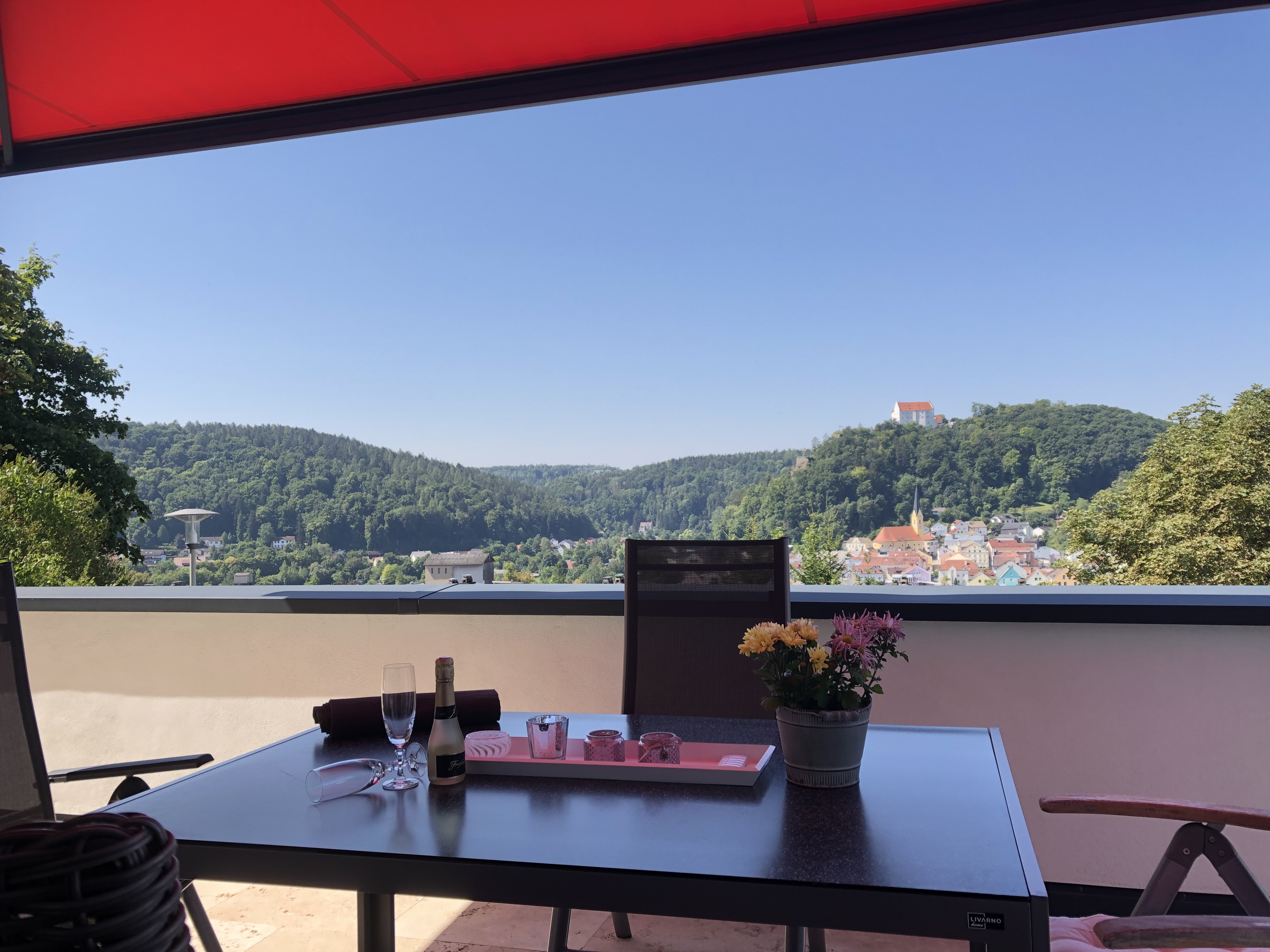 Es steht Ihnen eine möblierte Natursteinterrasse mit fantastischem Blick auf Riedenburg zur Verfügung.