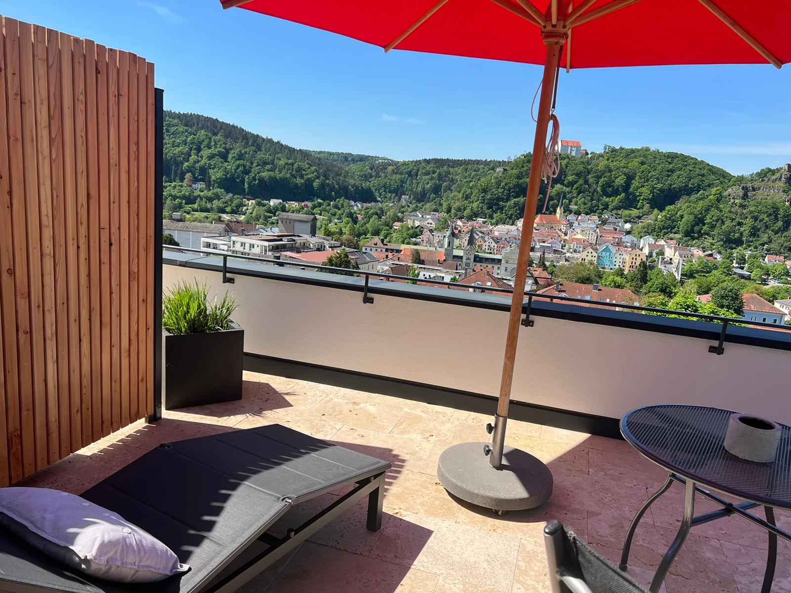 Es steht Ihnen eine möblierte Holzterrasse mit fantastischem Blick auf Riedenburg zur Verfügung.