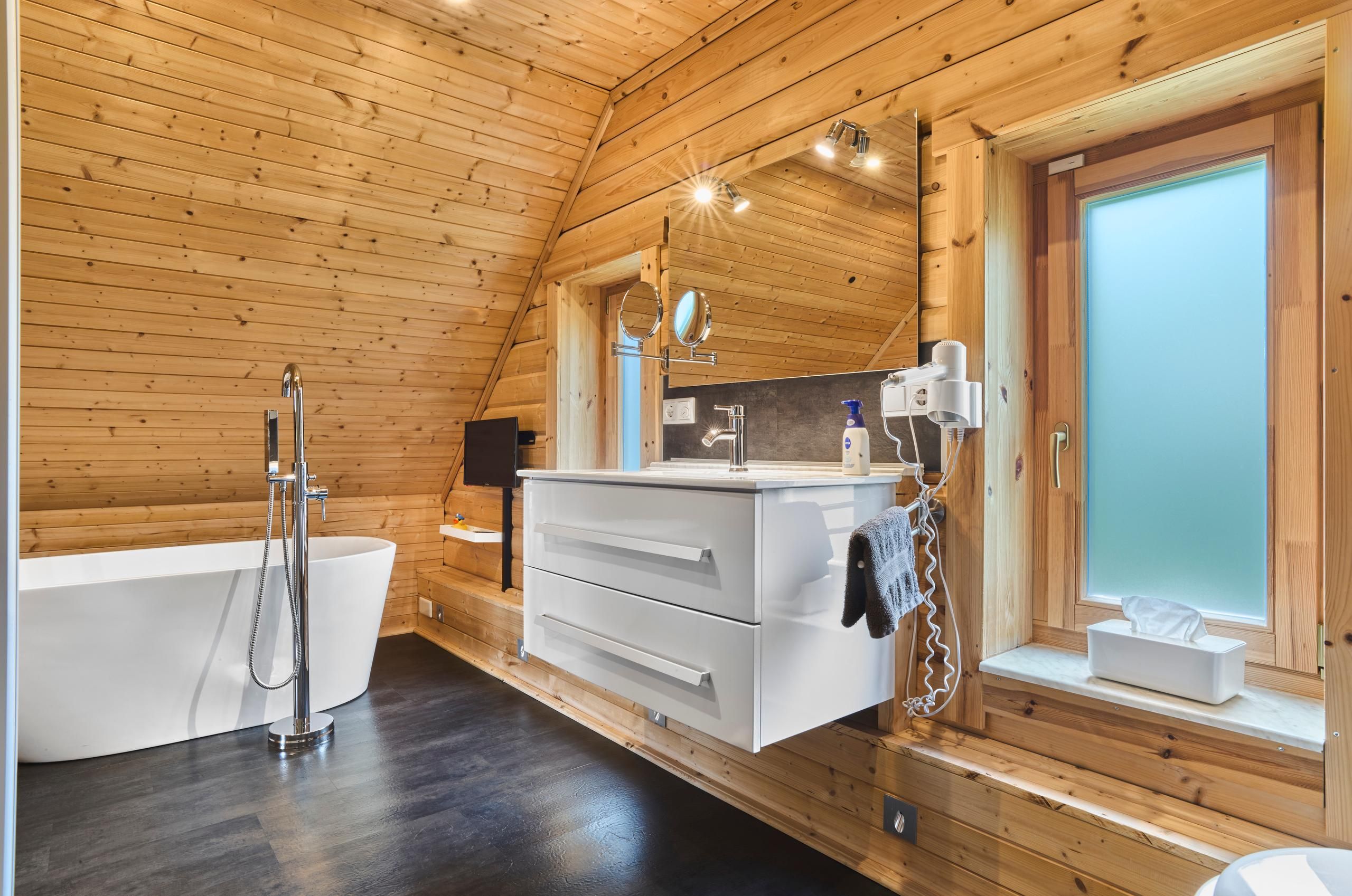 mit einer Badewanne, Dusche, WC inkl. Waschtisch, einem LED-TV (22‘‘, Satellit)