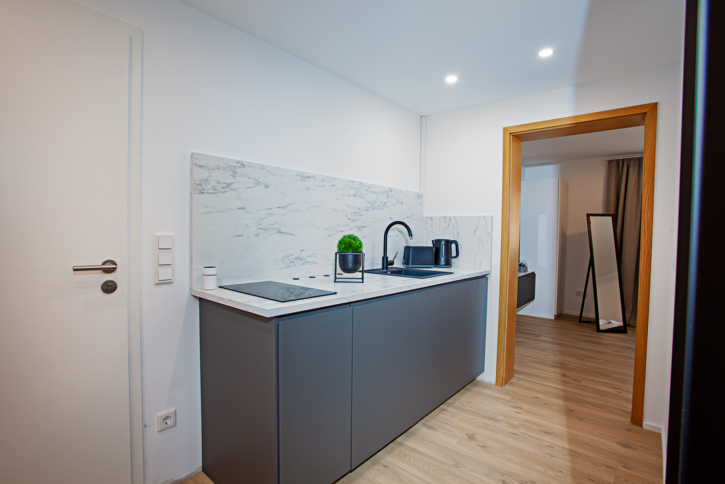 In allen Appartements befindet sich eine voll ausgestattete Küche mit Induktionsherd, Kühlschrank, Mikrowelle/Grillkombination, Wasserkocher und Nespresso-Kaffeemaschine. Das schöne wertige Koch- und Essgeschirr bereitet Selbstversorgern Vergnügen und lässt keine Wünsche offen. In jedem Zimmer befindet sich ein großer SMART – TV.