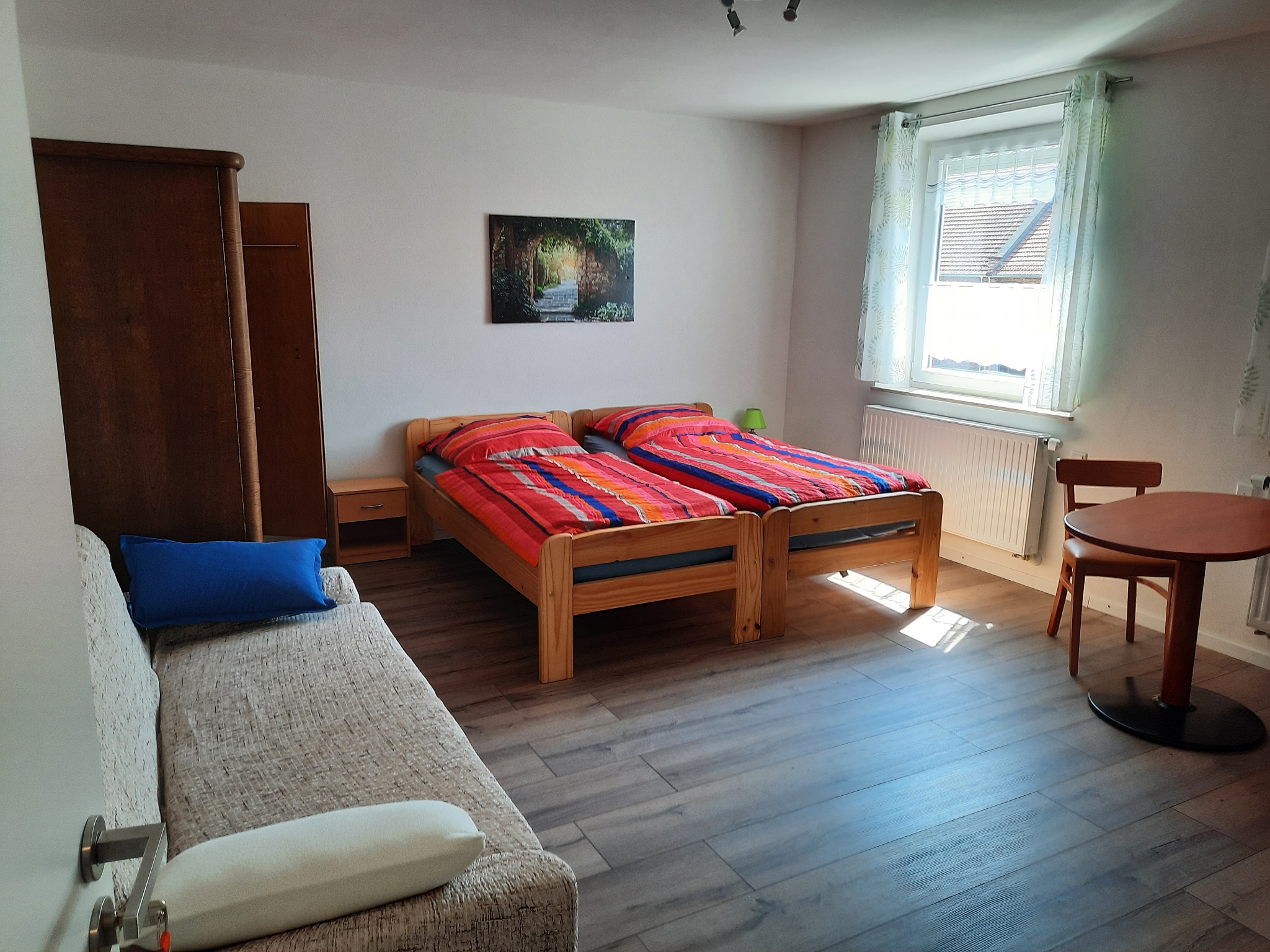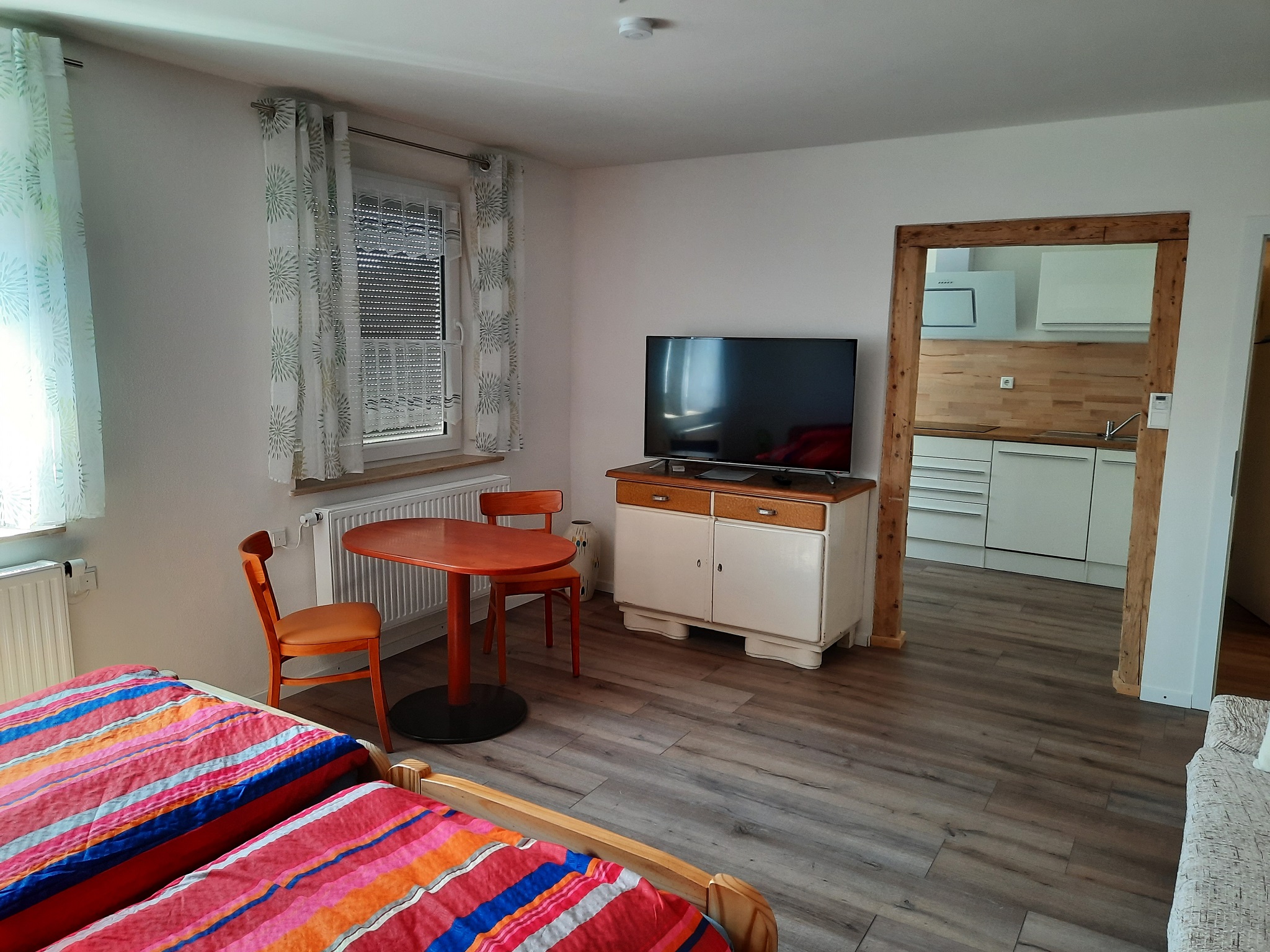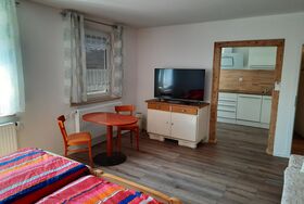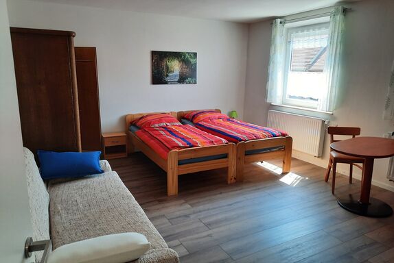 Appartement im ersten Stock. Ausgestattet mit Doppelbett, gemütlicher Couch und Essecke. Die Küche ist voll ausgestattet mit großem Kühlschrank mit Gefrierfach, Backofen, Spülmaschine, Mikrowelle, Kaffeemaschine, Wasserkocher, Toaster. Bad mit Dusche und WC. Handtücher und Bettwäsche sind inklusive.