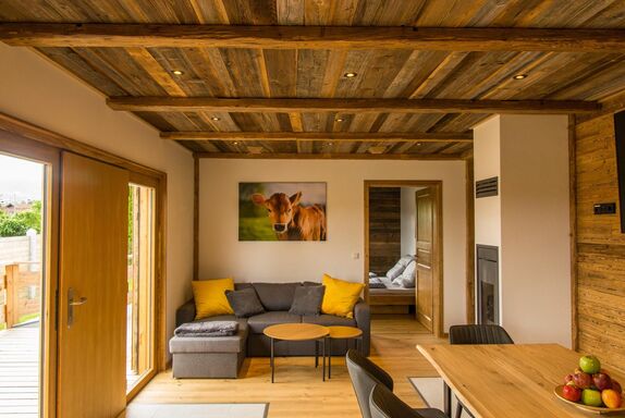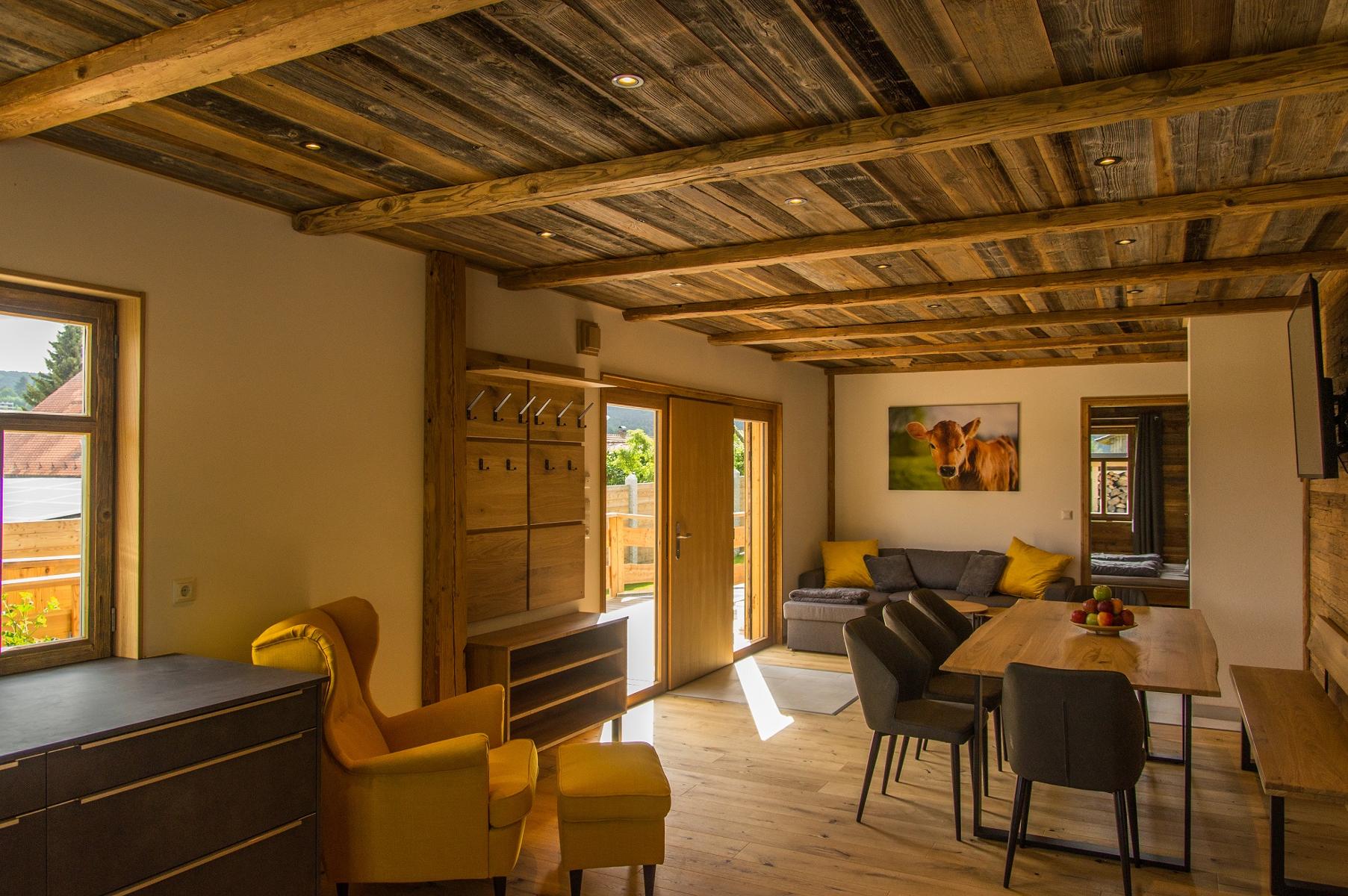 Unser 122m² großes Luxus Chalet wurde im Bayerwald-Stil unter Verwendung von handgehauenen Balken und verwitterten Stadl-Brettern gebaut und eingerichtet. Die perfekte Abstimmung aus Alt- und Neumaterialien ergibt ein tolles Wohnklima und vermittelt Behaglichkeit.