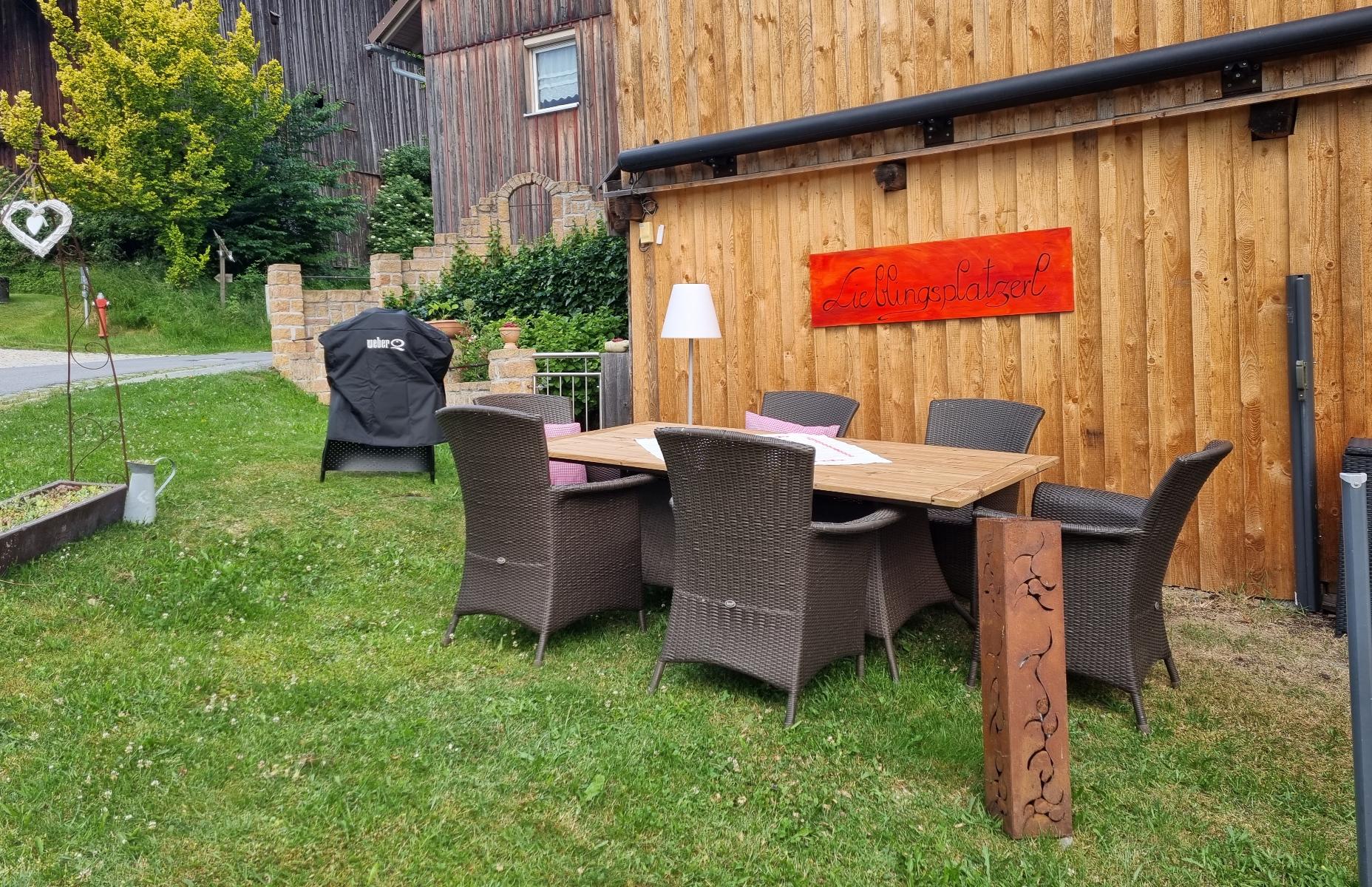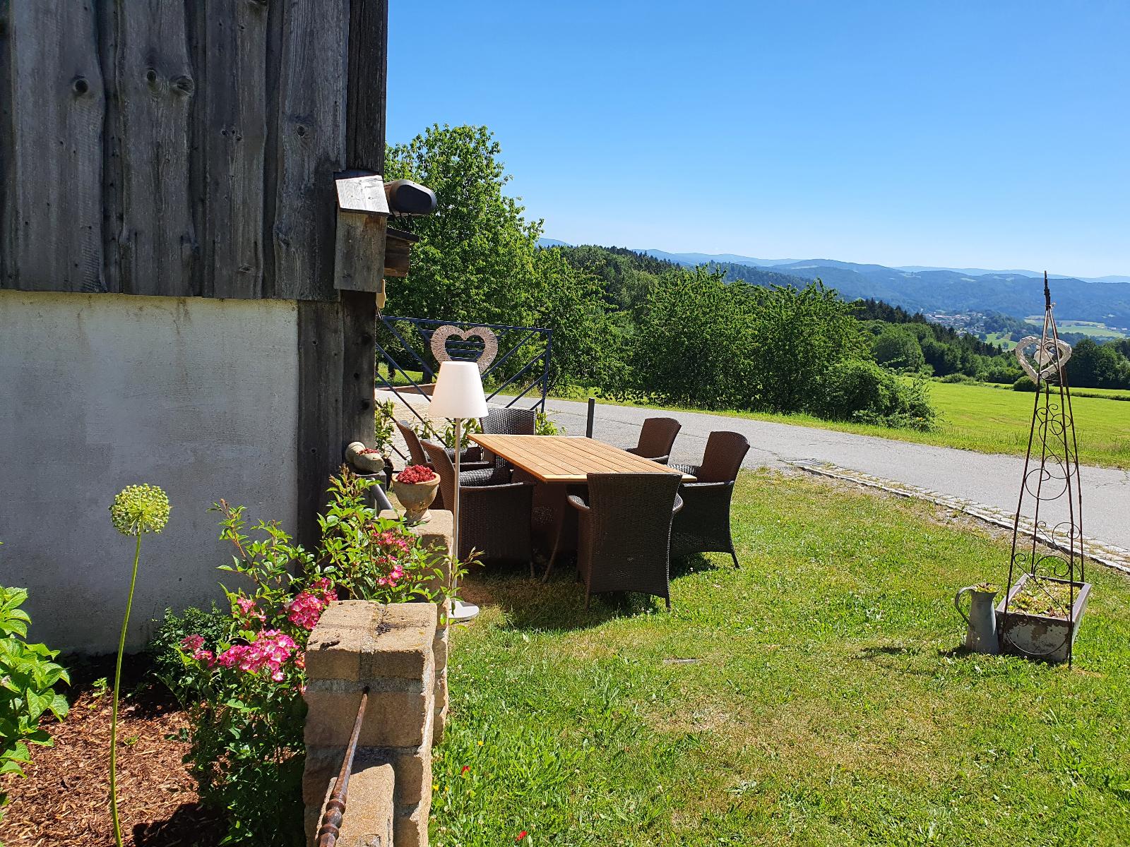 ein Sitzplatz im Freien mit beleuchteter Markise, Windschutz und einem Weber Grill, mit herrlichem Blick auf den Rachel und Dreisessel bis ins Mühltal nach Österreich hinein.