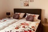 Schlafzimmer mit Doppelbett und Schrank (Bettwäsche vorhanden).