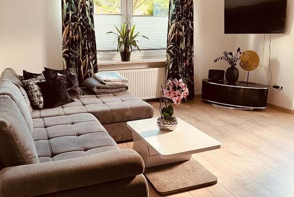 Wohnraum mit bequemer Couchgarnitur (ausziehbar) und Essecke.