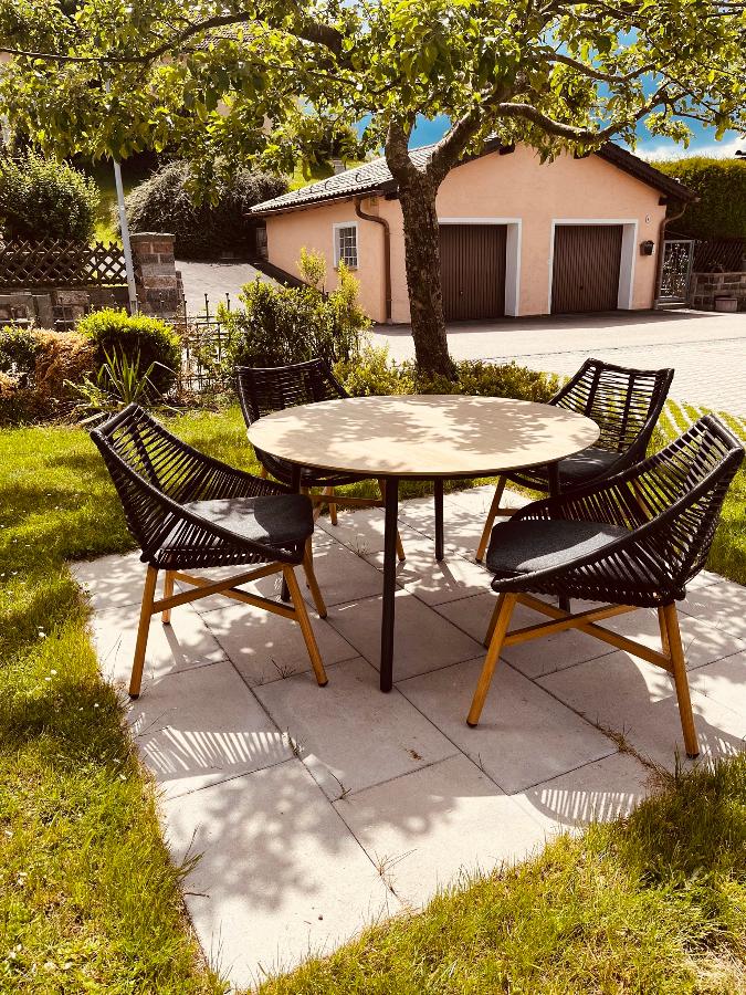 Garten mit modernen Möbeln, Liegen, Gasgrill.