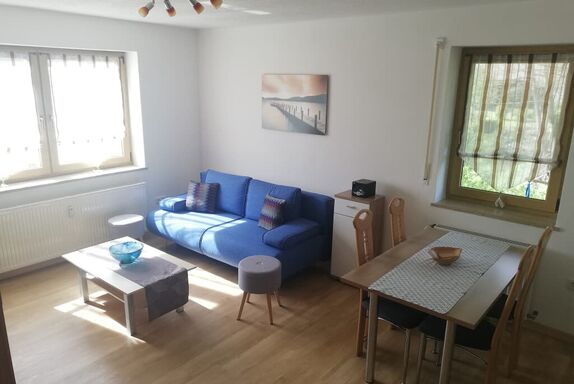 Die Wohnung besteht aus 4 Zimmern (Küche, Wohnzimmer, Schlafzimmer und Bad) sowie einem Abstellraum und ist ca. 70qm groß. Außerdem erwartet Sie eine am Fluss gelegene Terrasse, die zum Entspannen einlädt. Unsere Wohnung bietet für 2 Personen viel Platz und Komfort. Es können jedoch ohne Probleme zwei weitere Personen auf der Schlafcouch im Wohnzimmer Platz finden. Sollten Sie ein weiteres Zustell- oder Babybett brauchen, sprechen Sie uns bitte an.