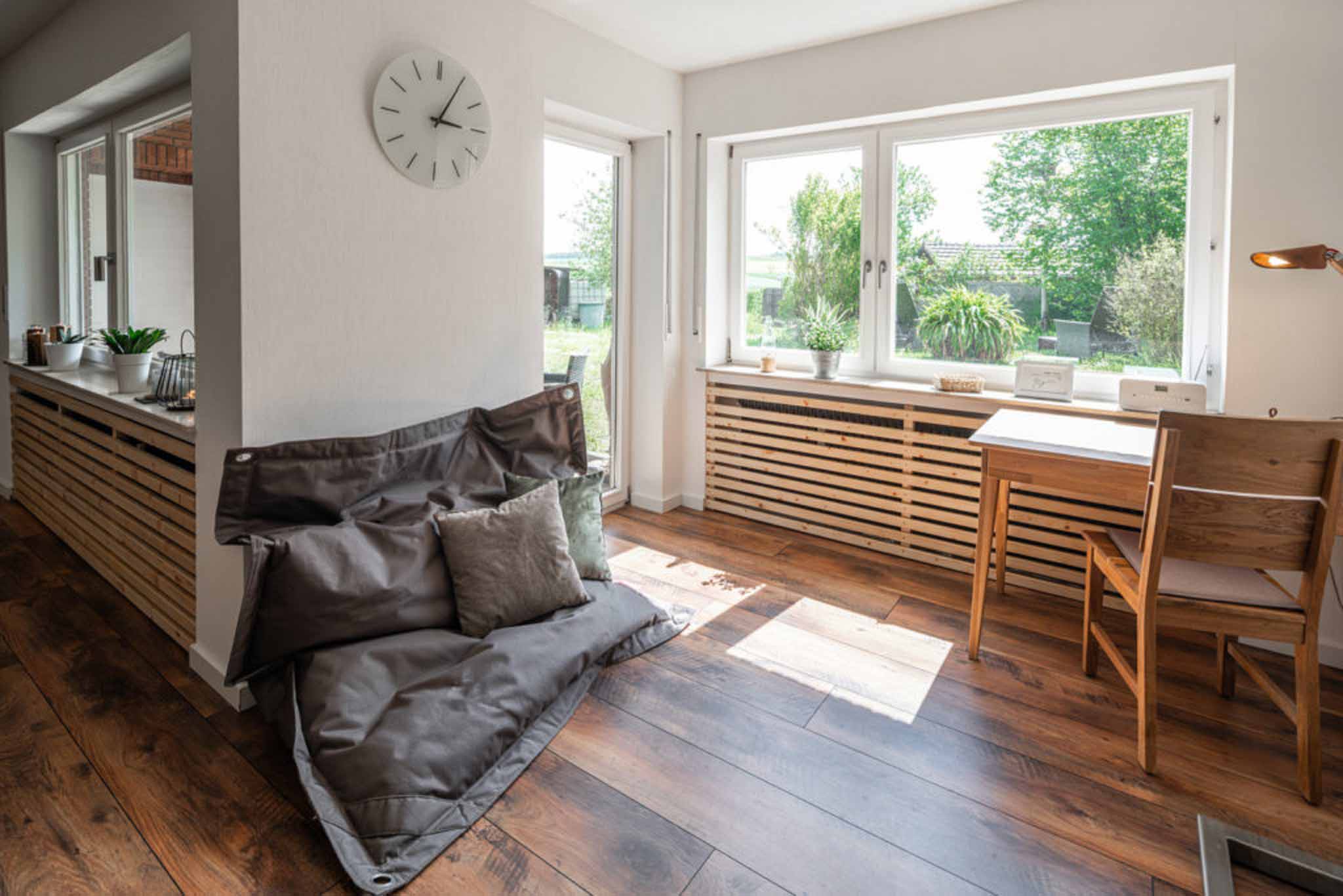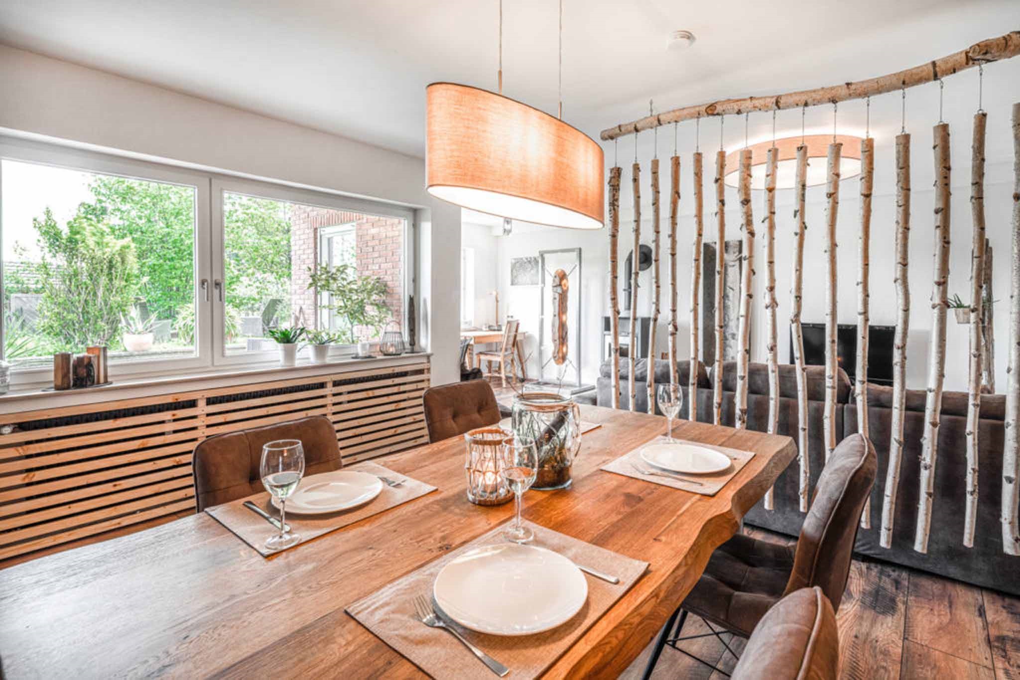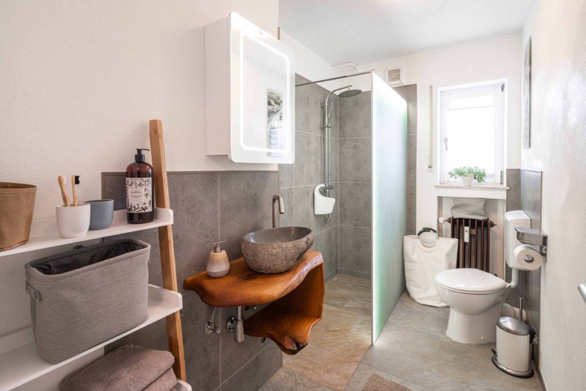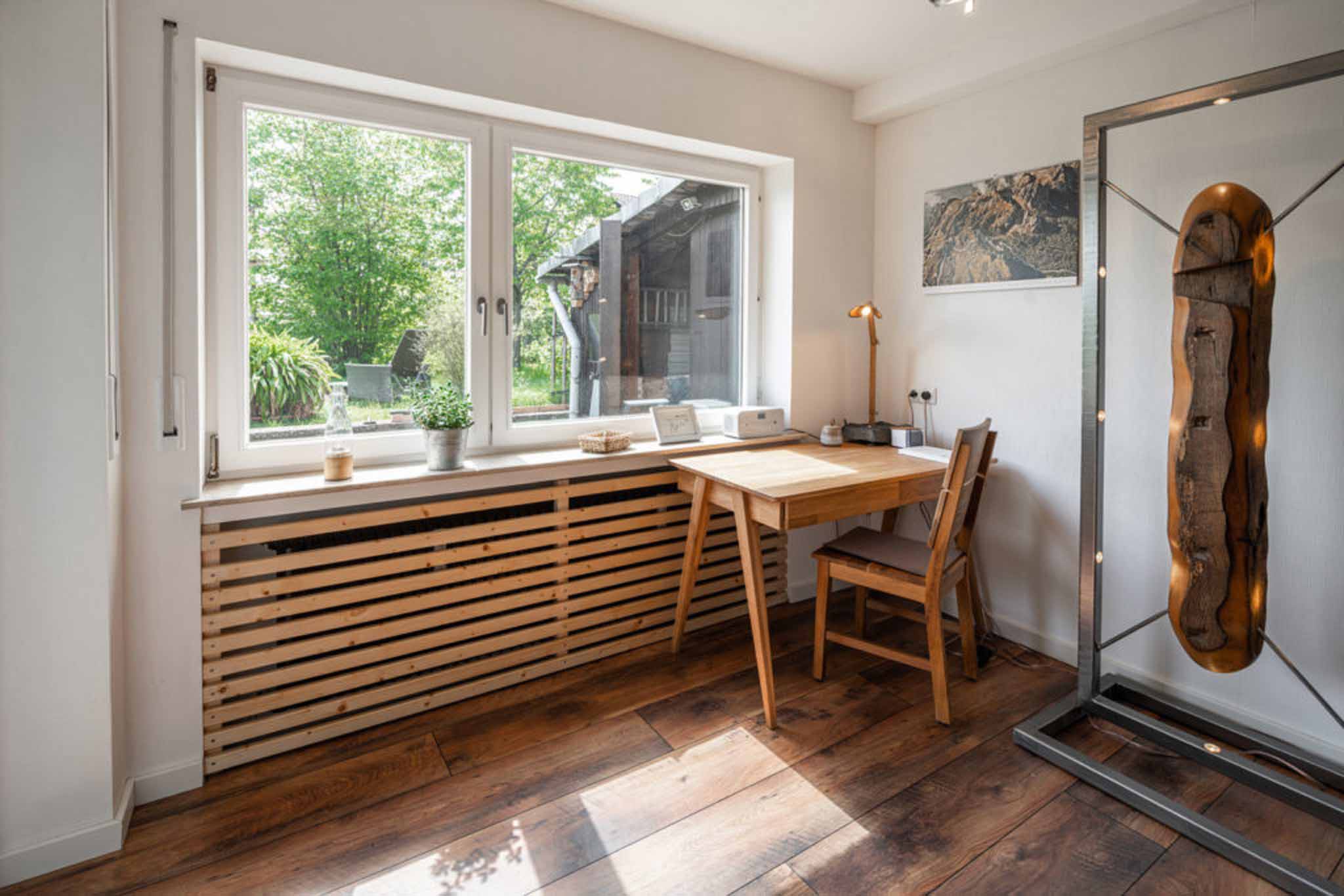 Bei der Ausstattung der Wohnung haben wir sehr viel Wert auf natürliche und hochwertige Materialien gelegt, um für euer Zuhause auf Zeit eine gemütliche Atmosphäre zu schaffen. Mit viel Herzblut hat Volker einen Teil der Einrichtung in Handarbeit selbst gefertigt. Folgende Ausstattung erwartet euch neben kostenlosem WLAN auf rund 90 qm: Der kombinierte Wohn-Essbereich ist ausgestattet mie einem Sofa (mit Ausziehfunktion), einem Flachbild-TV (inkl. Amazon Prime, Video, Disney+) außerdem einem Sitzsack, Sofadecken, einer Spiele- und Bücherecke, einer Arbeitsecke mit Schreibtisch sowie einem Bluetooth-Lautsprecher. Das Schlafzimmer verfügt über ein Massivholzbett (2x2m) sowie eine Sitzgelegenheit. Bettwäsche und Zusatzdecken sind vorhanden, ebenso eine Leselampe. Das Rollo ist mit einem Fliegengitter ausgestattet. Die Küche ist voll ausgestattet (u. a. mit einem Geschirrspüler, Toaster, Wasserkocher, Kaffeemaschine, Teekocher sowie einer Grundausstattung an Kaffee, Tee und Gewürzen). Im Bad befindet sich eine ebenerdige Regendusche, eine Waschmaschine sowie einem Föhn und Spiegelschrank. Ein Erste-Hilfe Set, Reinigungsset sowie Bügeleisen und Bügelbrett stehen kostenfrei zur Verfügung. Der Garten mit Gartenmöbeln kann gerne genutzt werden, eine Hängematte, Liegestühle und eine Feuerstelle sind vorhanden.