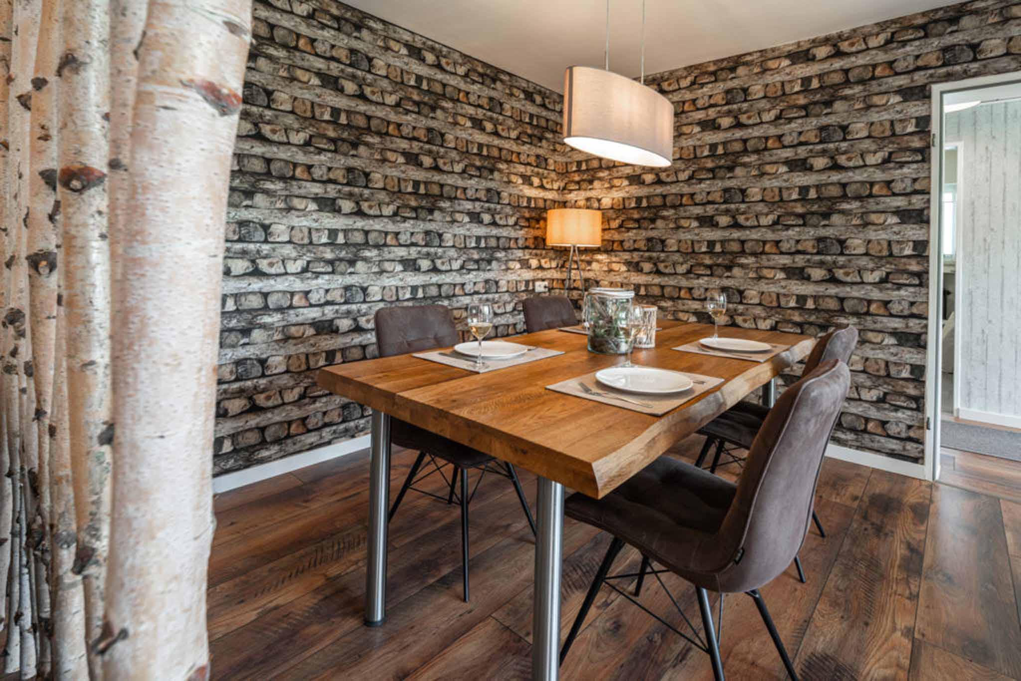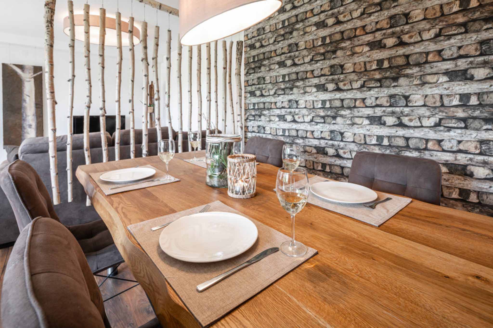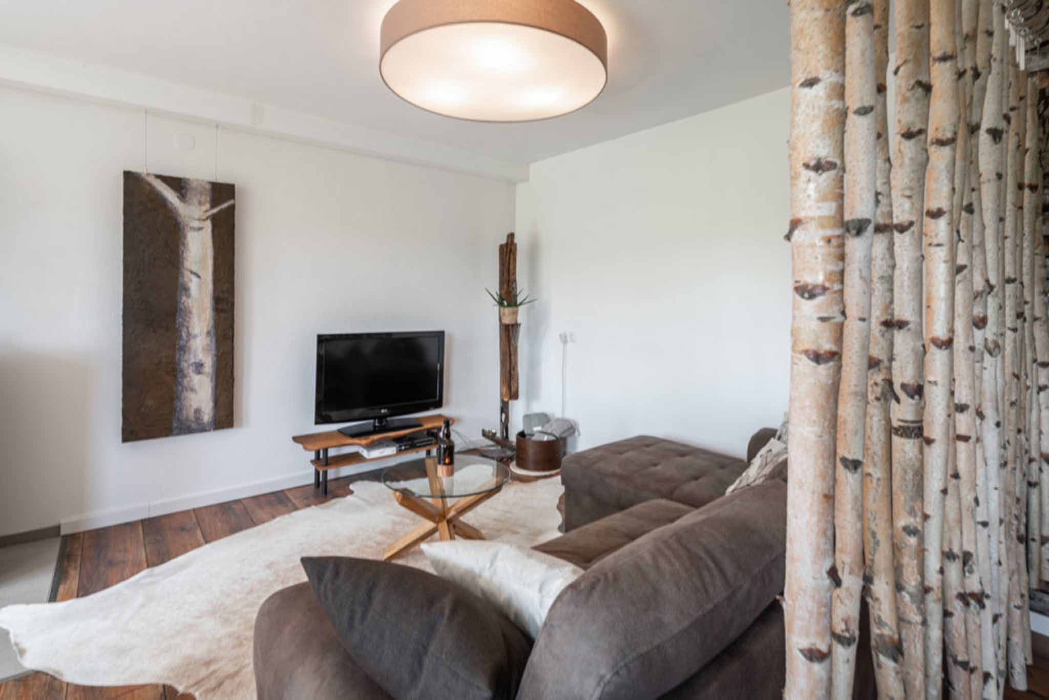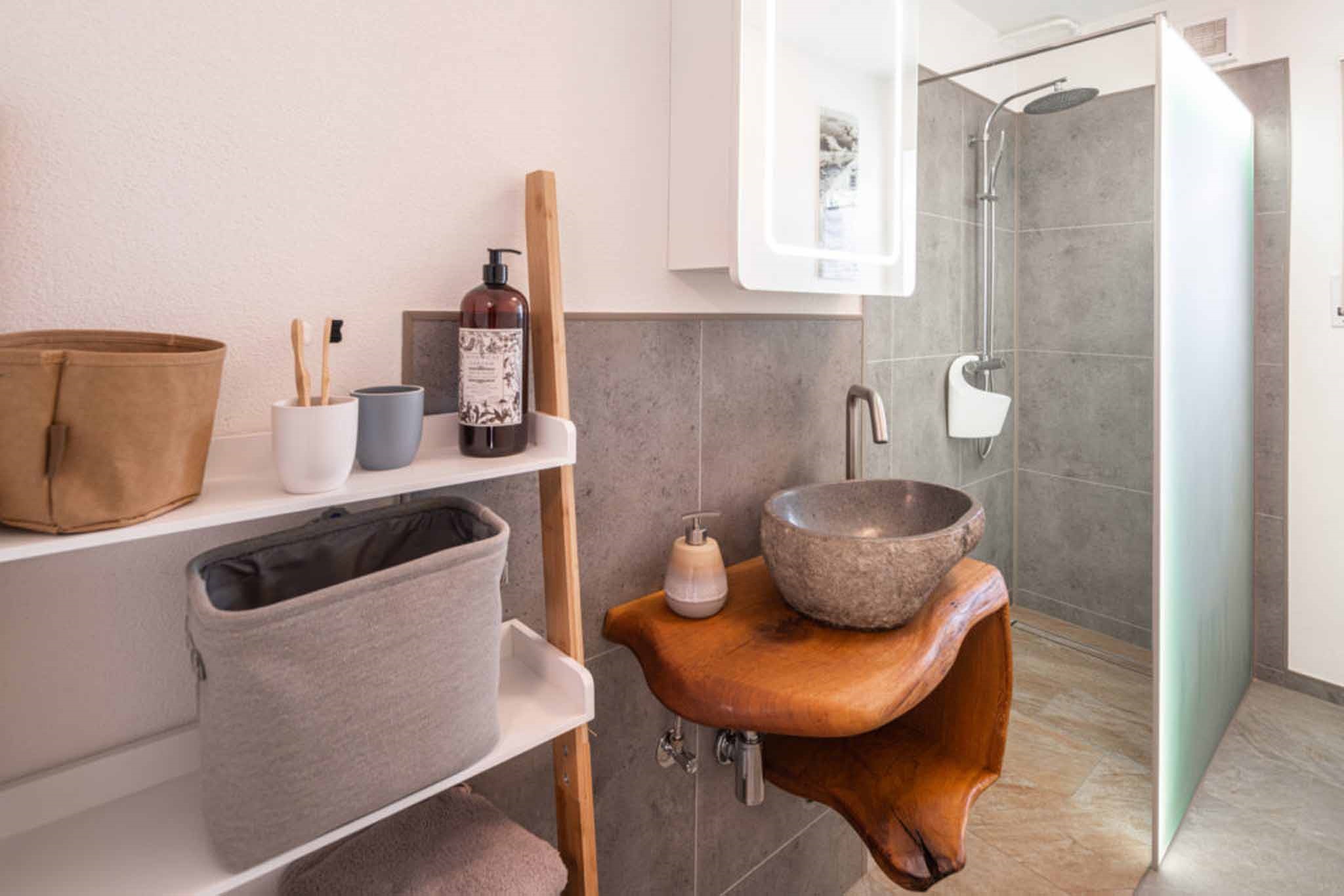 Bei der Ausstattung der Wohnung haben wir sehr viel Wert auf natürliche und hochwertige Materialien gelegt, um für euer Zuhause auf Zeit eine gemütliche Atmosphäre zu schaffen. Mit viel Herzblut hat Volker einen Teil der Einrichtung in Handarbeit selbst gefertigt. Folgende Ausstattung erwartet euch neben kostenlosem WLAN auf rund 90 qm: Der kombinierte Wohn-Essbereich ist ausgestattet mie einem Sofa (mit Ausziehfunktion), einem Flachbild-TV (inkl. Amazon Prime, Video, Disney+) außerdem einem Sitzsack, Sofadecken, einer Spiele- und Bücherecke, einer Arbeitsecke mit Schreibtisch sowie einem Bluetooth-Lautsprecher. Das Schlafzimmer verfügt über ein Massivholzbett (2x2m) sowie eine Sitzgelegenheit. Bettwäsche und Zusatzdecken sind vorhanden, ebenso eine Leselampe. Das Rollo ist mit einem Fliegengitter ausgestattet. Die Küche ist voll ausgestattet (u. a. mit einem Geschirrspüler, Toaster, Wasserkocher, Kaffeemaschine, Teekocher sowie einer Grundausstattung an Kaffee, Tee und Gewürzen). Im Bad befindet sich eine ebenerdige Regendusche, eine Waschmaschine sowie einem Föhn und Spiegelschrank. Ein Erste-Hilfe Set, Reinigungsset sowie Bügeleisen und Bügelbrett stehen kostenfrei zur Verfügung. Der Garten mit Gartenmöbeln kann gerne genutzt werden, eine Hängematte, Liegestühle und eine Feuerstelle sind vorhanden.