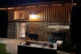 Eine Terrasse mit herrlichem Blick in die Natur, Holztischgruppe, Außenbadewanne und Liegeschaukel für zwei und ein gemauerter Grill lädt Sie zum enspannen und wohlfühlen ein.