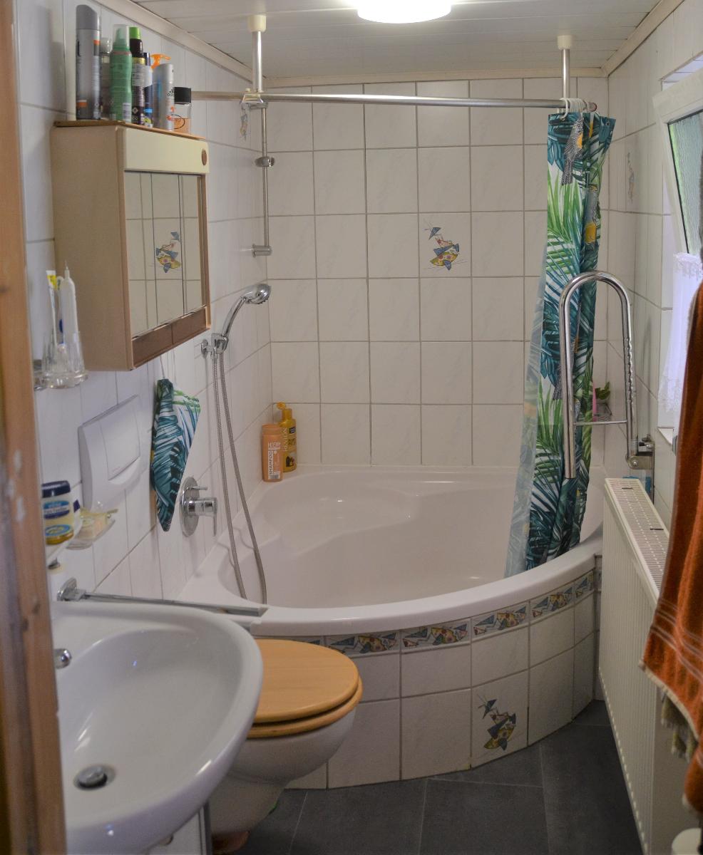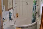 einem Doppelbett. Das funktionelle Badezimmer mit Eckbadewanne Fußbodenheizung und Handtuchtrockner rundet das