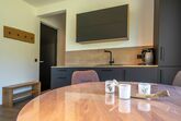 Großzügige Wohn-Ess-Küche mit großem Esstisch für 4 Personen, Zugang zur Terrasse mit Blick auf unser Hirschgehege. Kühlschrank, Spülmaschine, Ceranfeld mit 2 Kochstellen, Filterkaffeemaschine, Wasserkocher, Toaster und reichhaltiges Geschirr. Geschirrtücher werden gestellt.