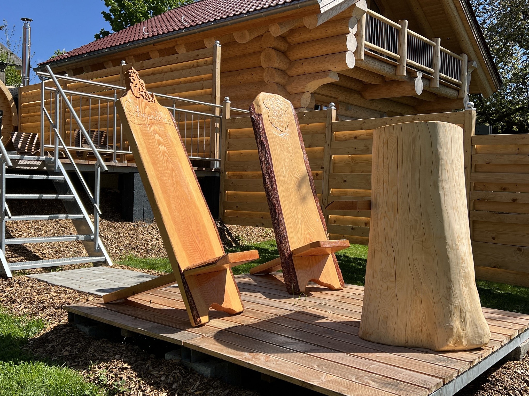 Wir wollen keine Sterne verkaufen, sondern Sie in ein Lebensgefühl der besonderen Art entführen. Sie werden ein Blockhaus beziehen, welches nachhaltig und nach traditioneller kanadischer Bauweise mit heimischen Hölzern aus Deutschland erstellt wurde. Innenausbau, diverse Möbel, Türen als auch die Unikate von Waschbecken und vieles mehr wurden nicht nur von uns selbst entworfen, sondern auch selbst angefertigt. Das Chalet ist ca. 110 qm groß und bietet Platz für bis zu 6 Personen. Auf zwei Etagen befinden sich 2 Schlafzimmer, eines mit einem Doppelbett, das zweite mit 2 Einzelbetten, eine voll ausgstattete Küche (mit Induktionsherd, Spülmaschine und natürlich auch ein Mikrowellenherd, Spülmaschine, Kaffeevollautomat), ein Wohnzimmer, ein Badezimmer mit Dusche und WC. Im Wohn-Essbereich befindet sich ein Esstisch, eine Couch (Schlafcouch) sowie ein Fernseher. Wlan und ein Parkplatz stehen kostenfrei zur Verfügung. Ein Pallets-Ofen sorgt für wohlige Wärme. Besondere Highlights sind der Whirlpool im Freien und die Fasssauna, sowie eine Wellnessdusche und ein Sitzbad. Diese Annehmlichkeiten stehen exklusiv zur Verfügung. Zudem erwartet Sie ein reichhaltig gefüllter Begrüßungskorb mit selbst gemachten Köstlichkeiten.