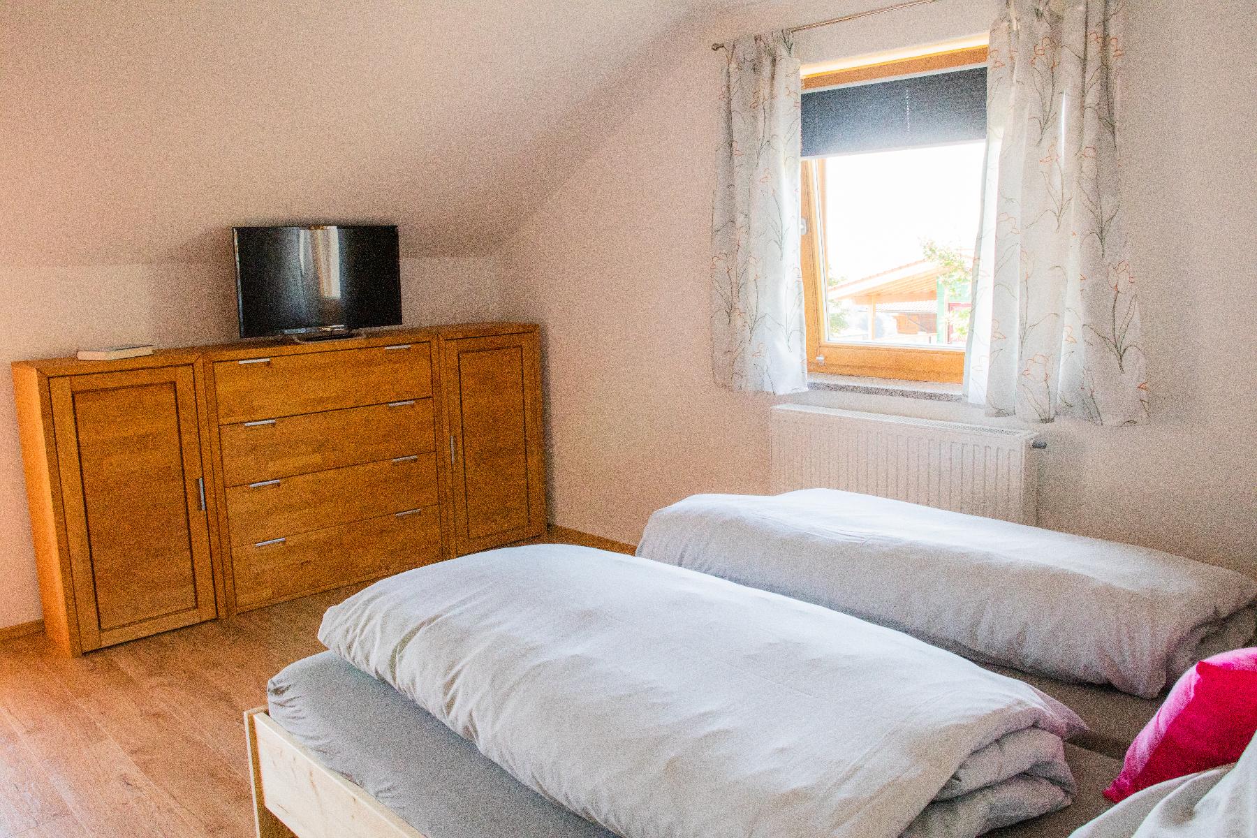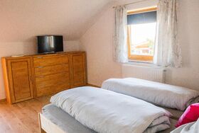 Unsere schöne 90qm große Ferienwohnung im Dachgeschoss mit großer Terrasse bietet Platz für bis zu 4 Personen. Es gibt 2 Schlafzimmer mit je einem Doppelbett sowie ein kombiniertes Ess-Wohnzimmer mit einem Sofa sowie einer SAT-TV Anlage und einem Esstisch für 4 Personen. Die große Einbauküche ist voll ausgestattet und verfügt unter anderem über einen Geschirrspüler sowie einen Gefrierschrank etc. Im Bad gibt es eine Badewanne, ein Waschbecken sowie ein WC. Wlan und Kurkarte mit Osserbad+ sind im Preis inklusive. Bett- und Tischwäsche sowie Handtücher sind vorhanden. Auf der Terrasse stehen Gartenmöbel. Hier können Sie die Sommerabende mit Blick über Lohberg ausklingen lassen