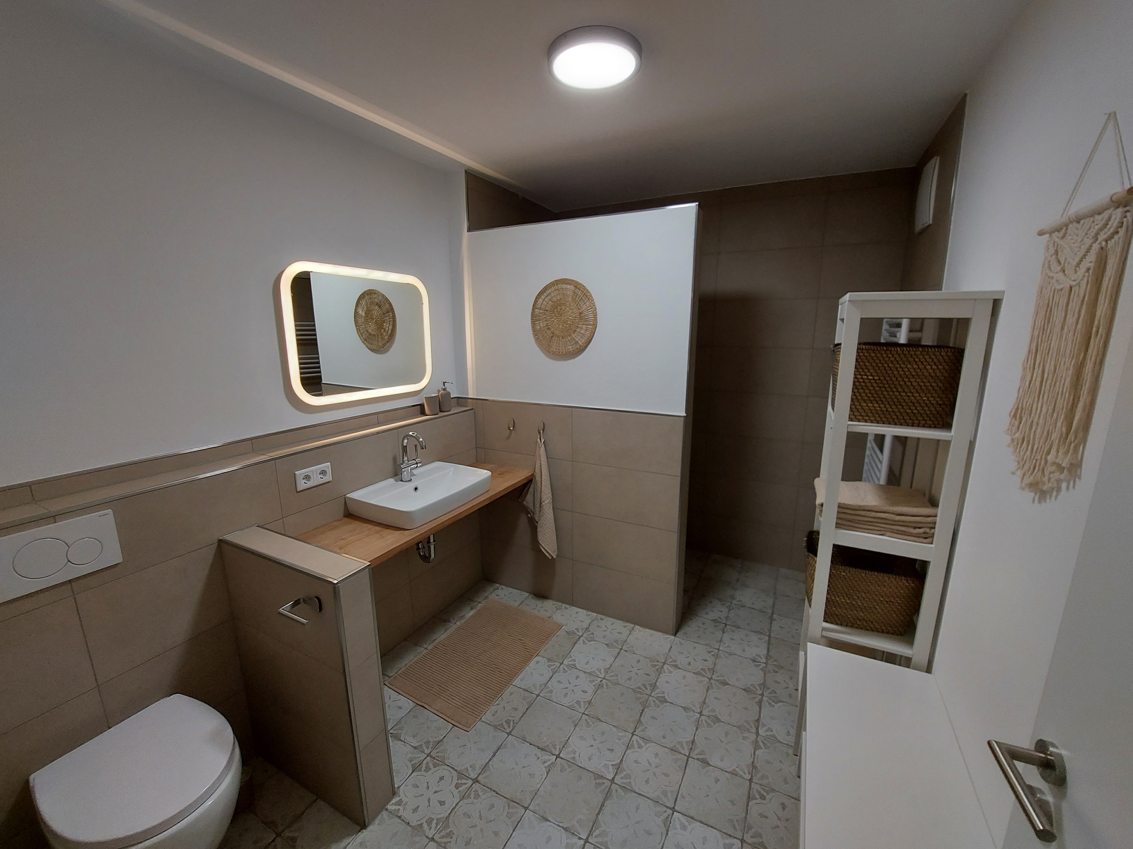 Der lichtdurchflutete Wohnraum enthält eine große Küchenzeile, einen Esstisch sowie einem Schlafsofa und einem Flachbildfernseher. Auf der Terrasse der Ferienwohnung können Sie den ganzen Tag über Sonne tanken. Das Schlafzimmer ist mit einem Boxspringdoppelbett und einem großen Wandschrank ausgestattet sowie kleinen Schrank, der genügend Platz für Kleidung bietet. Das Badezimmer ist mit einem WC, einem Waschbecken sowie einer ebenerdigen Regendusche als auch mit Hand- und Badetüchern ausgestattet. Die Küche impliziert eine Kühl- Gefrierkombi, einen Herd mit Backrohr, einen Geschirrspüler, eine Mikrowelle sowie Kaffeemaschine, Wasserkocher, etc…. Das Geschirr ist ebenfalls vorhanden.