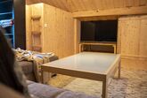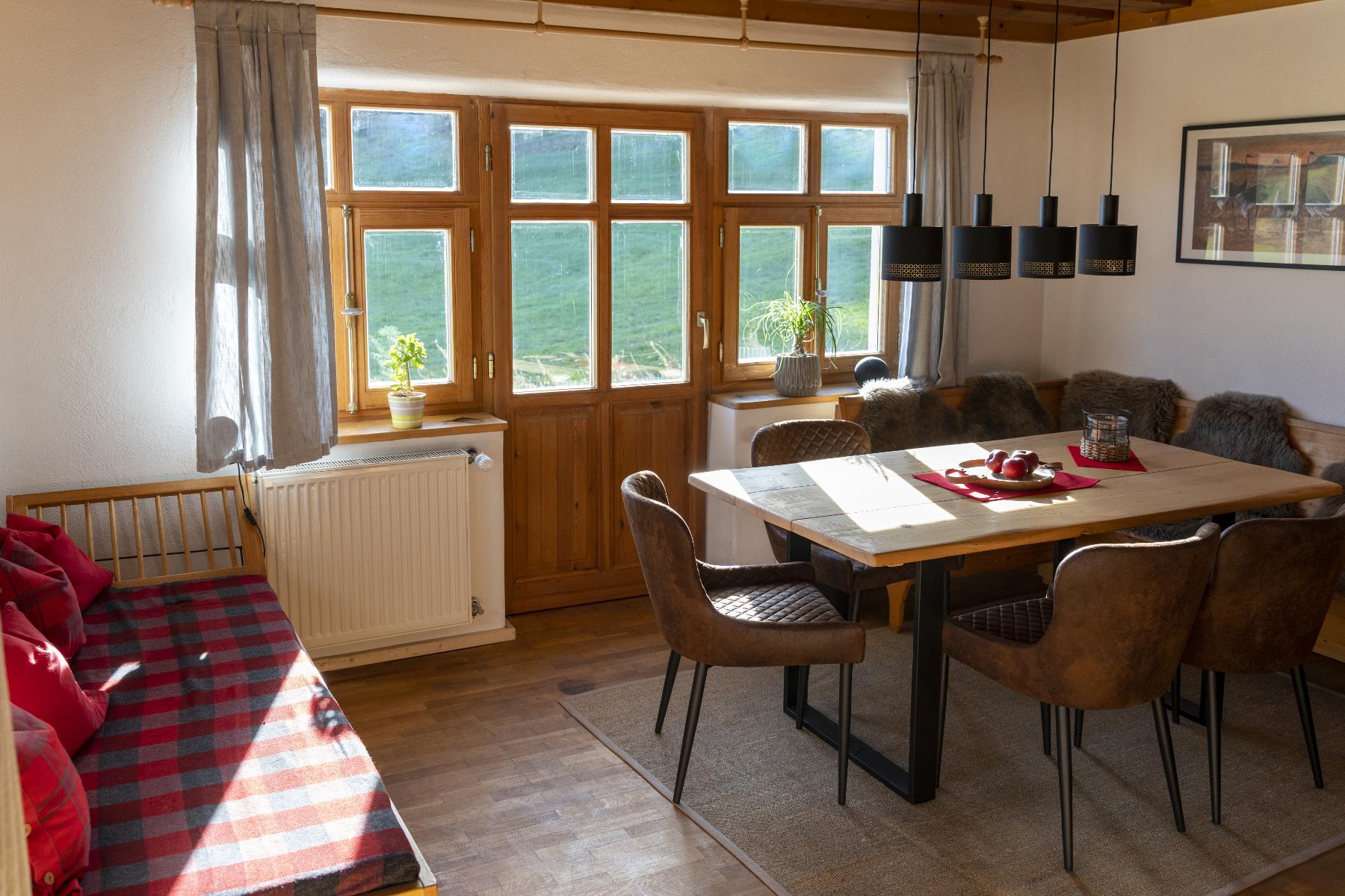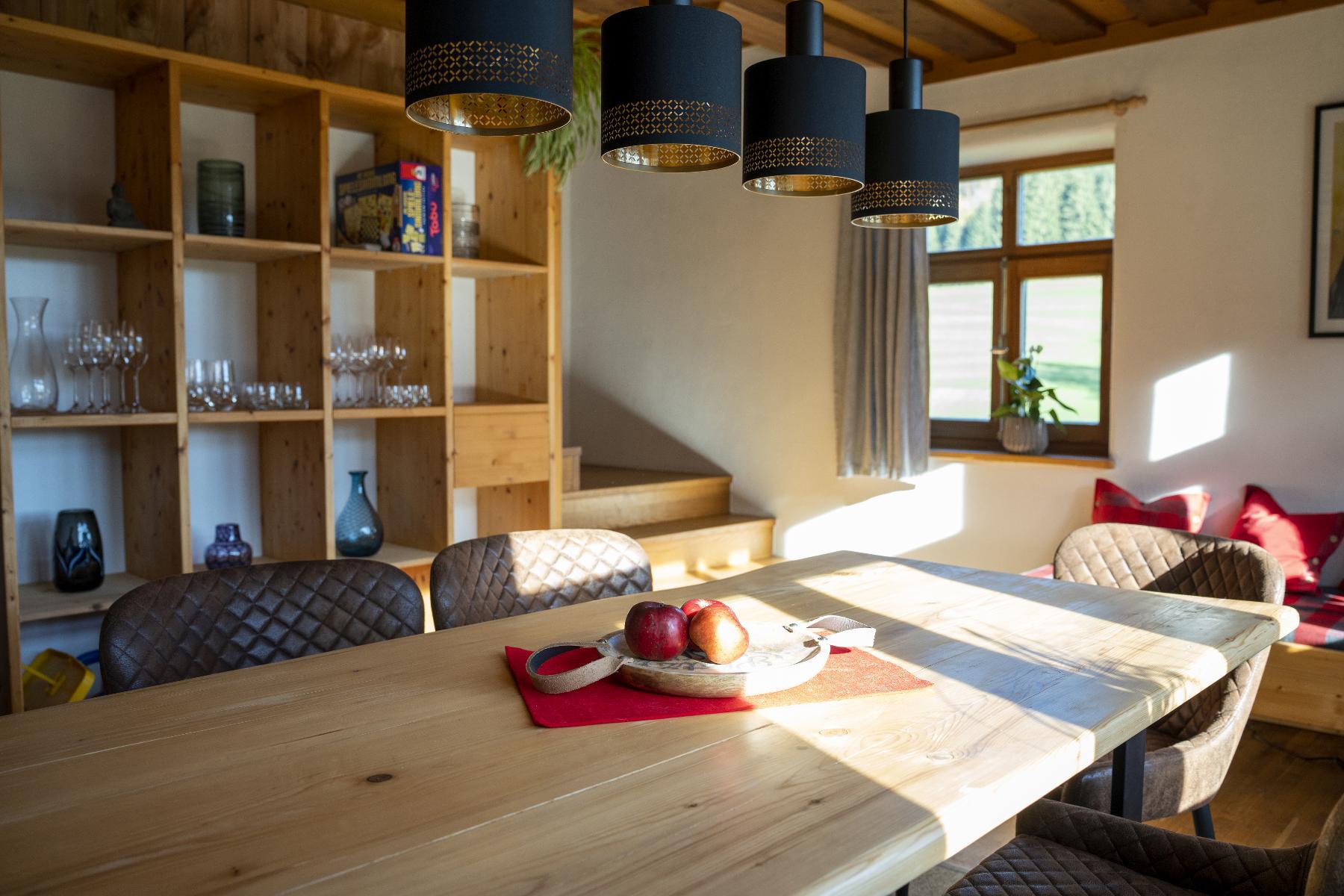 Innen ist fast alles aus Massivholz. Die Decken in Küche und Esszimmer sind mit großen Holzdielen bestückt, wie in traditionellen Berghütten.