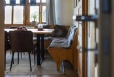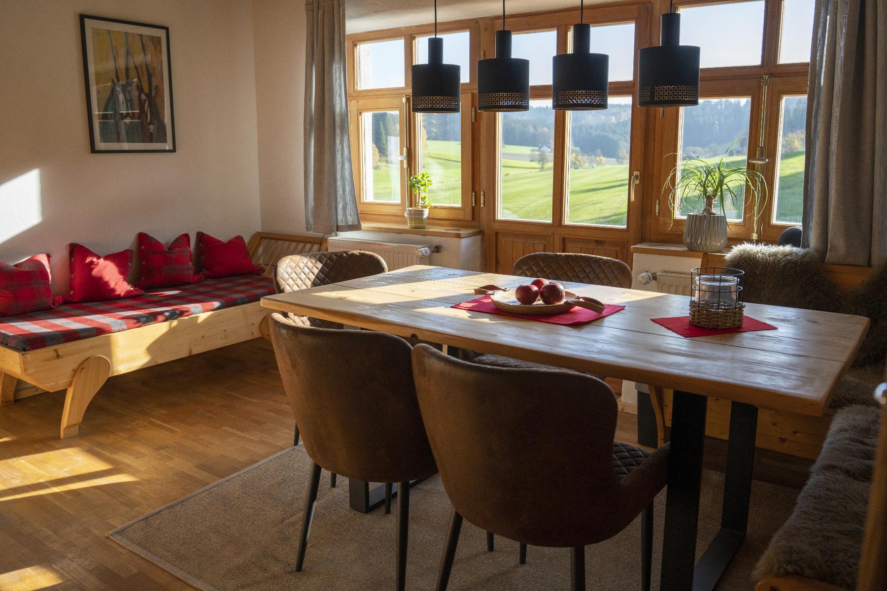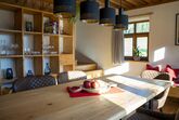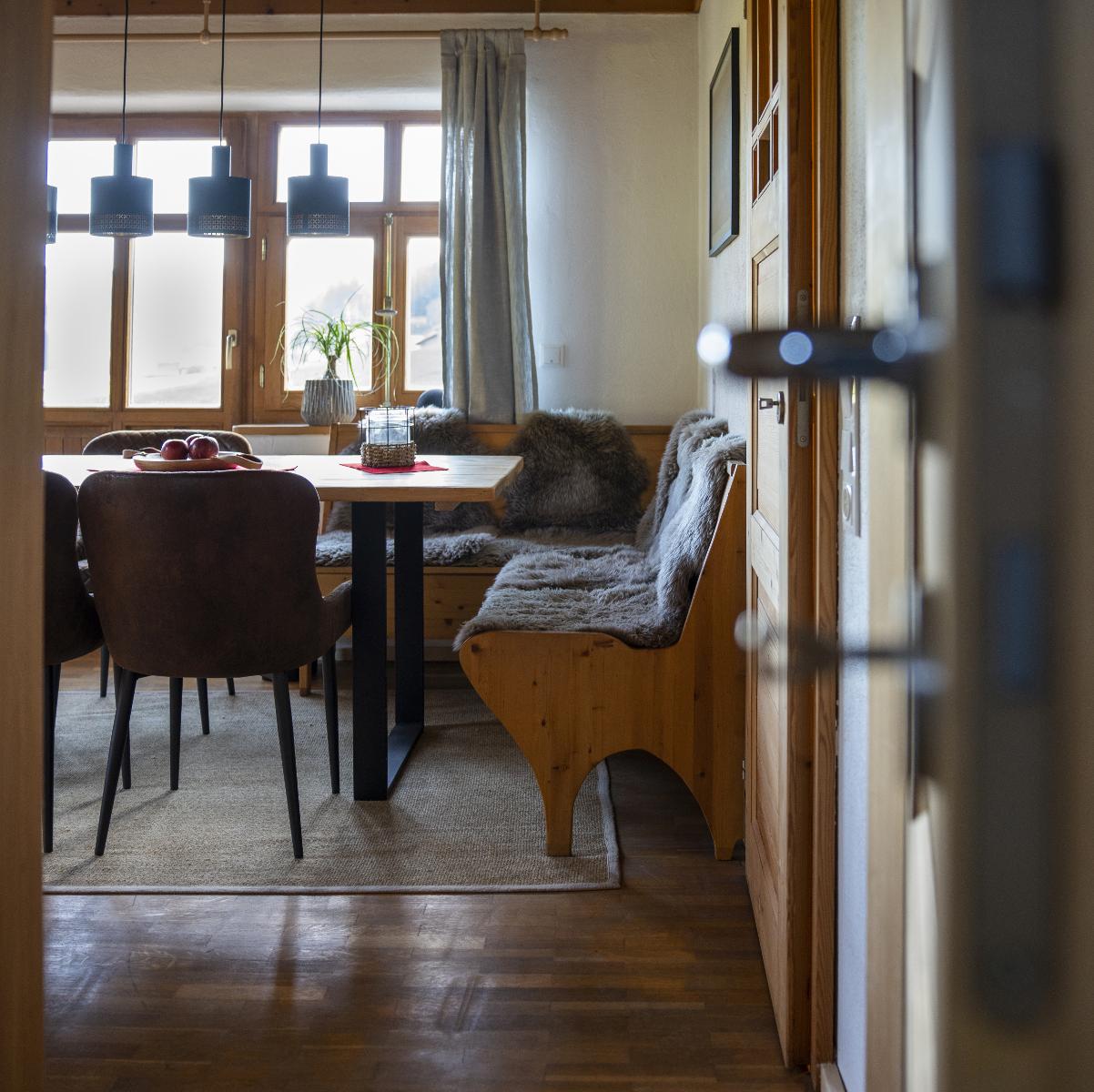 Die voll ausgestattete Küche wird ergänzt durch einen großen Essbereich mit massivem Holztisch und Eckbank.