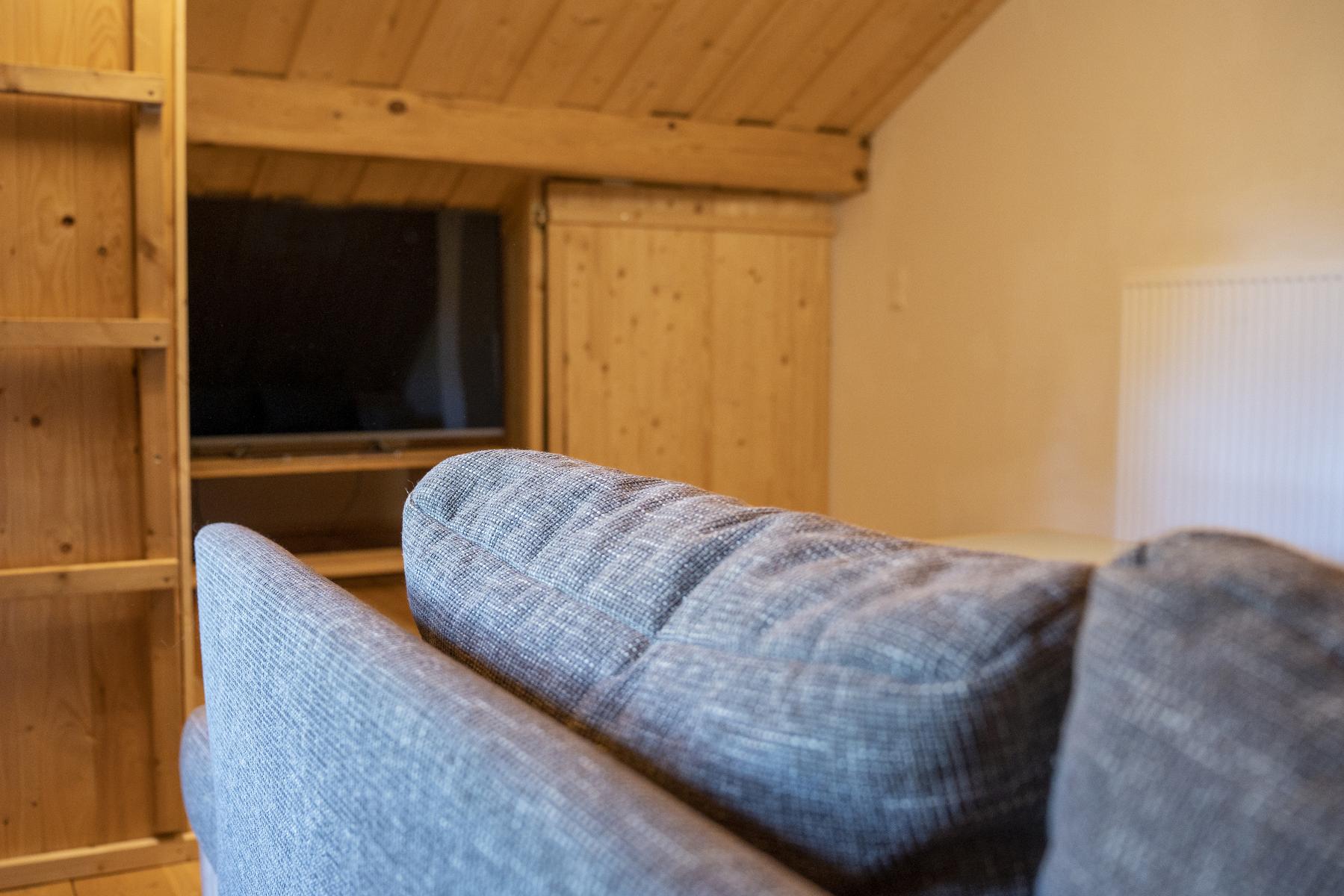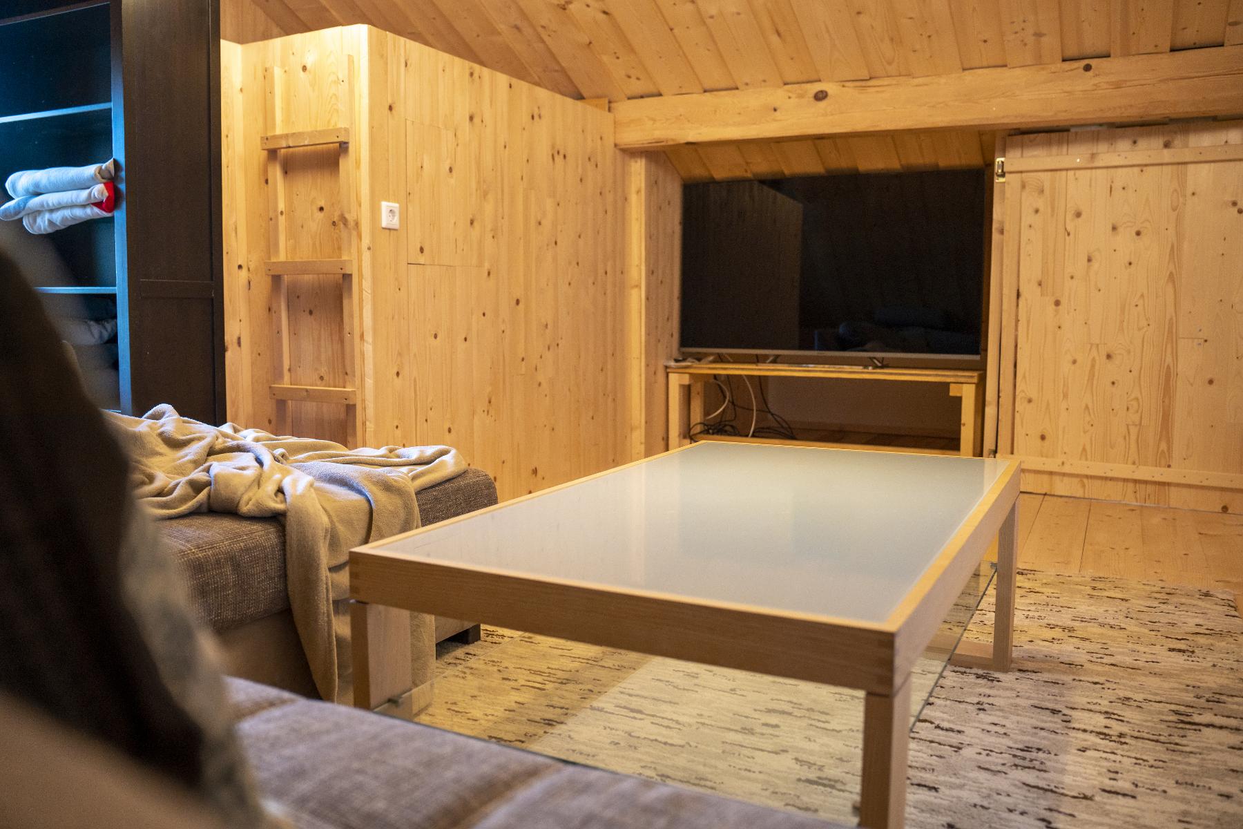 Im Geheimraum welcher nur über eine steile Treppe erreichbar ist, befindet sich ein weiteres gemütliches Zimmer(Wohnzimmer) welches zum Fernsehen oder Spielen einlädt.