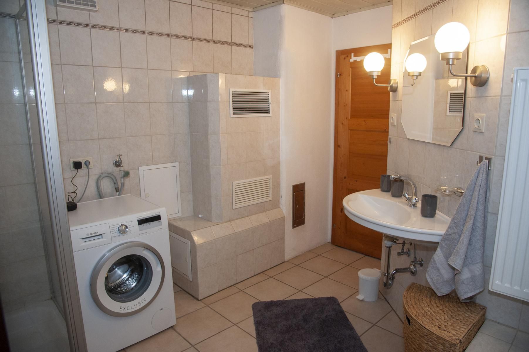 Das Bad verfügt über eine Dusche, WC, Badewanne und Waschmaschine, sowie Seife/Duschgel und einem Fön.