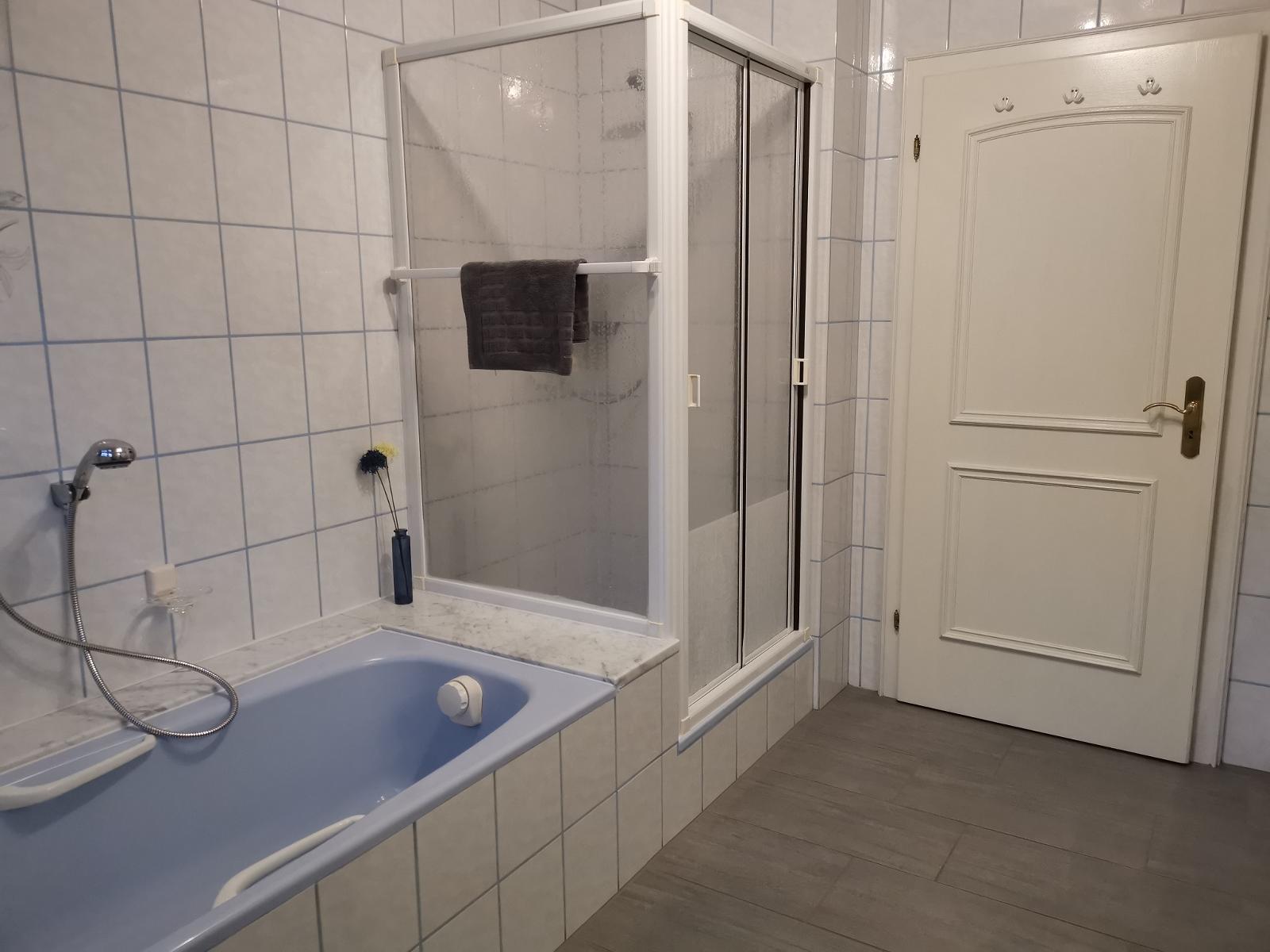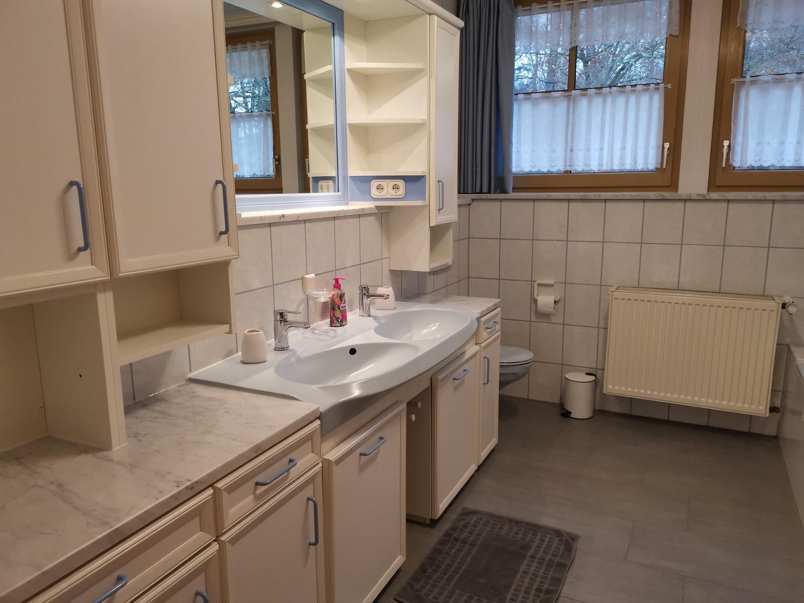 Das große Tageslichtbadezimmer mit zwei Waschbecken, Badewanne und Dusche rundet das Gesamtbild ab.