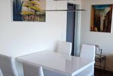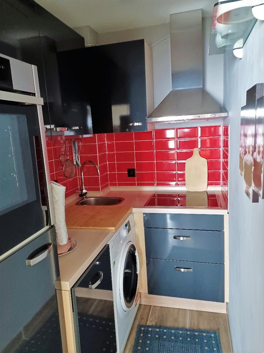 Bequemes Boxspring Doppelbett, inklusive Bettdecken und Kissen, Bade-, Hand- Geschirrtücher, Duschvorlage, Couchtisch, großer geräumiger Wohnzimmer Schrank, Flachbildschirm TV/Radio, moderne Sitz- Essecke mit Tisch und 4 bequemen Polster Stühlen, voll ausgestattete moderne Hochglanz Einbauküche (Farbe grau) mit Ceran Kochfeld, separater Backofen mit allen Funktionen (auch Grill), Toaster, Kaffeemaschine, Wasserkocher, Kühlschrank mit Gefrierfach, Spül- und Waschmaschine, Badezimmer Dusche (Wanne 80 x 80 cm) mit WC, Flur mit Garderobe und Schiebetür Schrank inkl. Staubsauger und diverser Reinigungsausstattung, großzügiger Balkon ausgestattet mit Tisch, Stühlen, verstellbaren Alu Sesseln und Sonnenschirm.