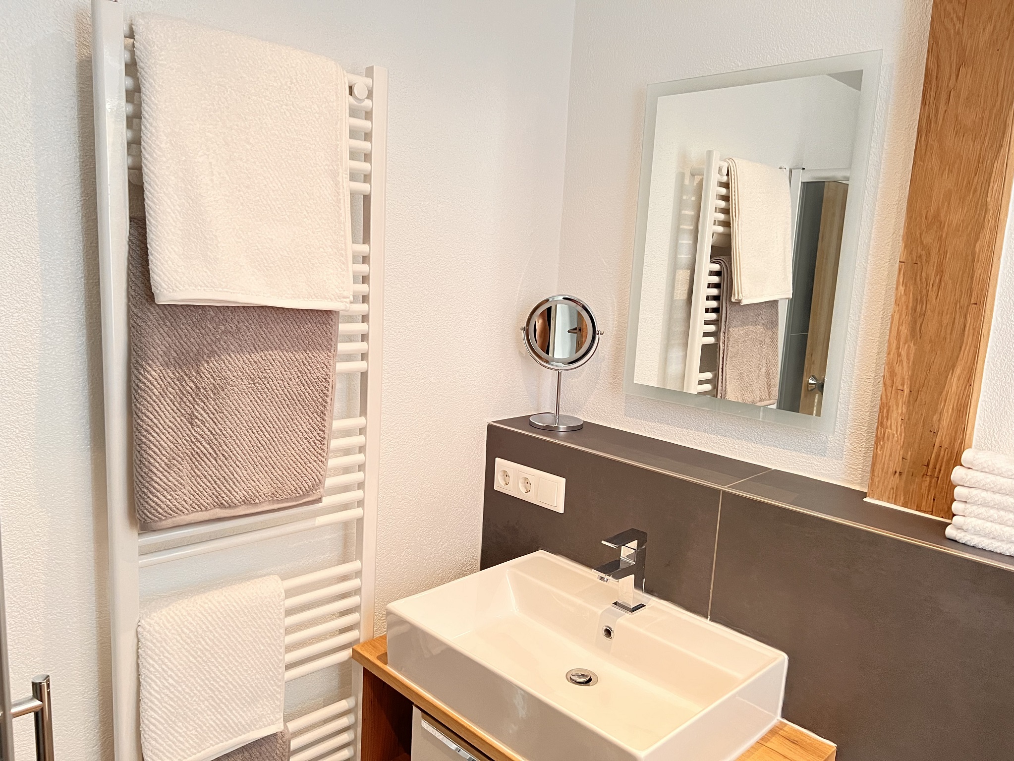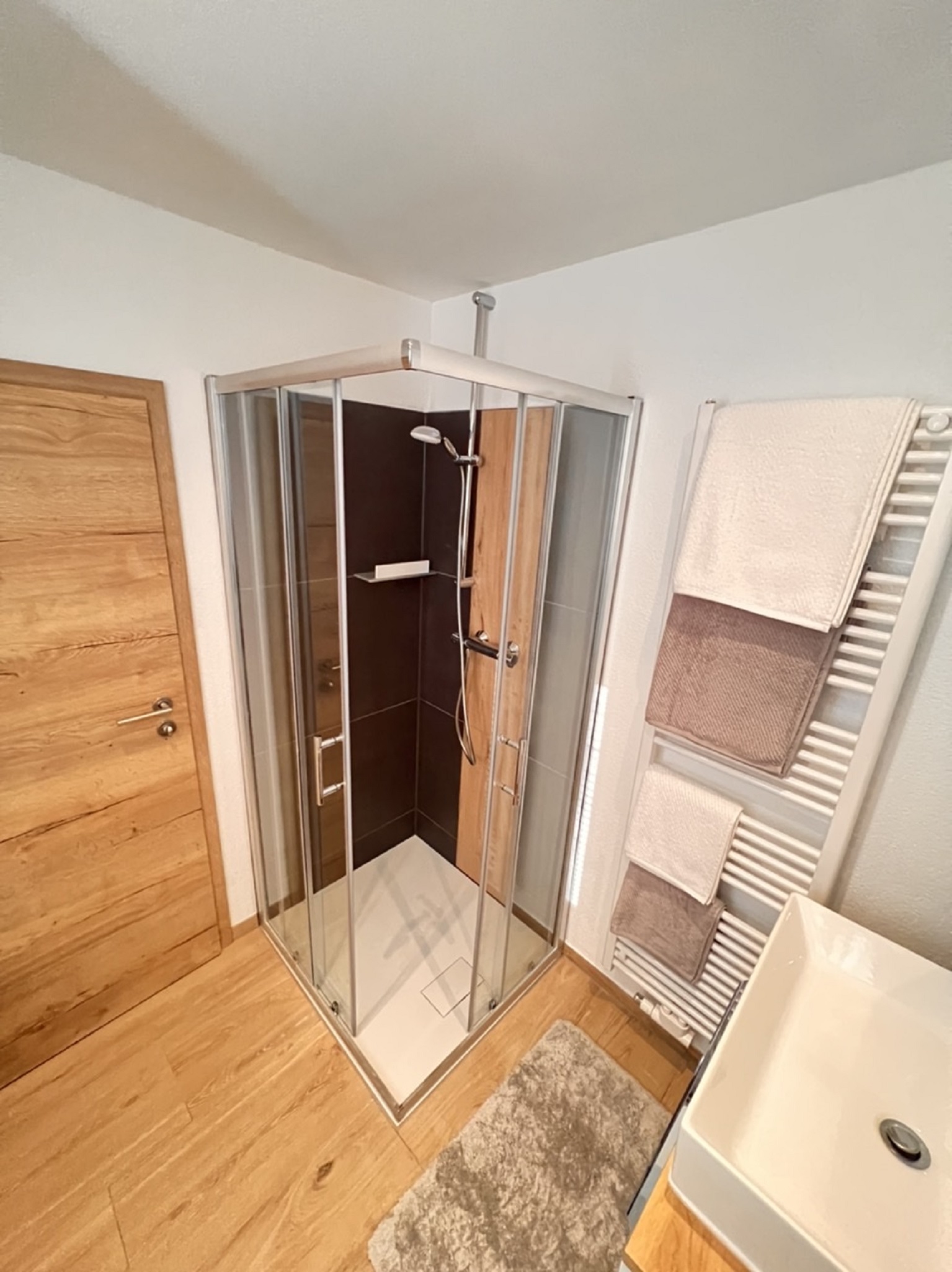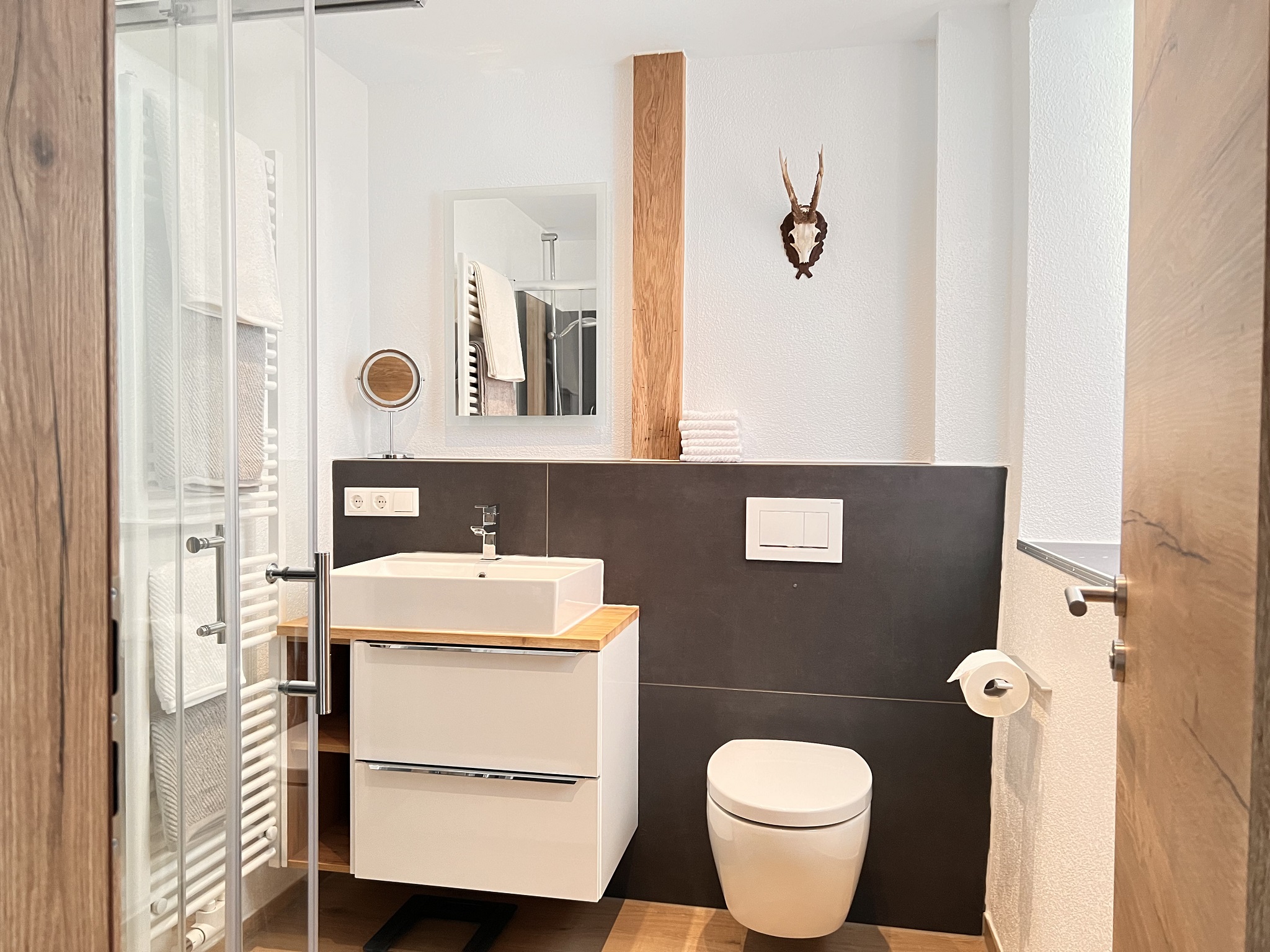 Das Badezimmer ist mit einer Dusche, WC und einem Waschbecken mit Unterschrank ausgestattet.