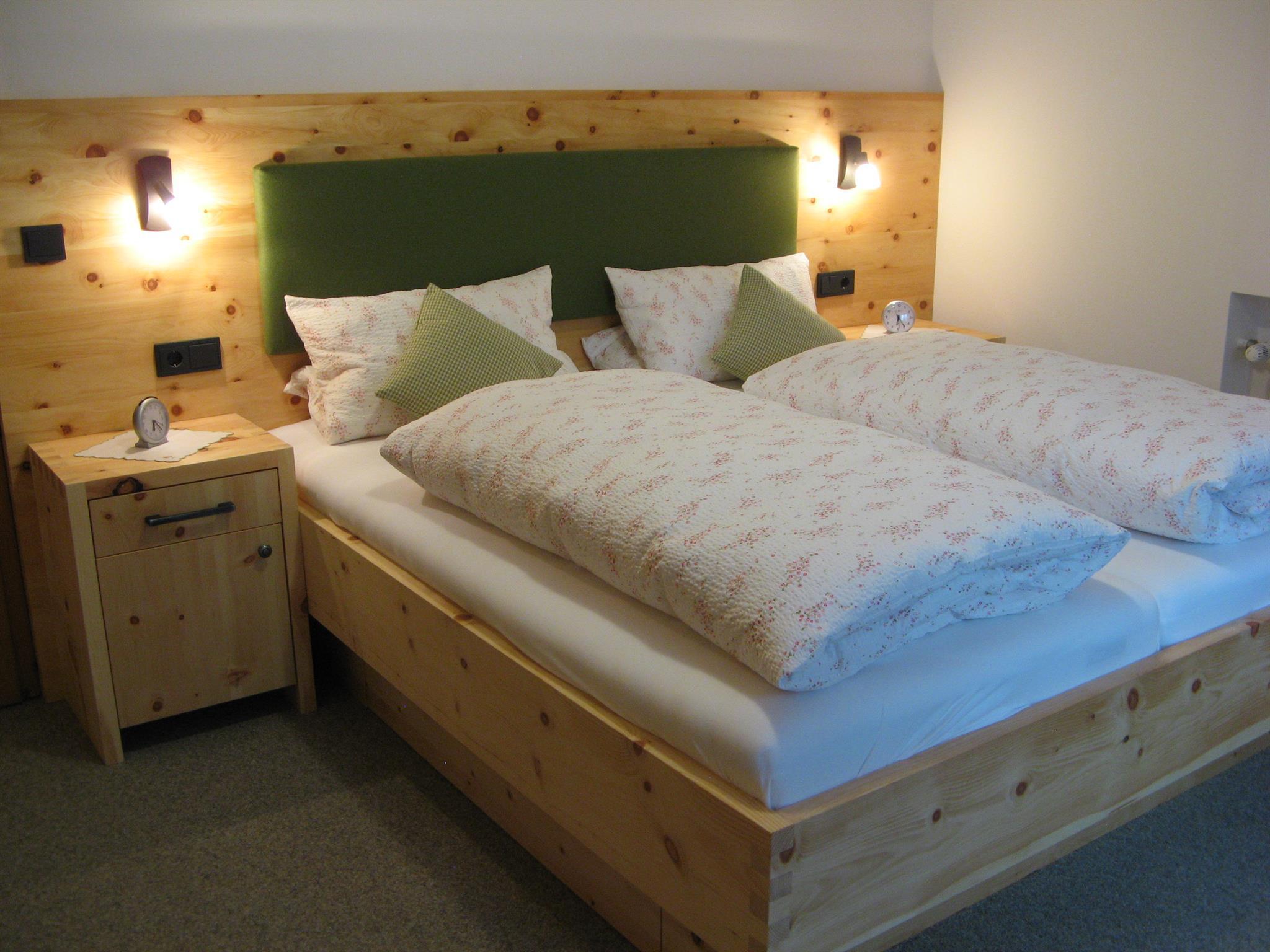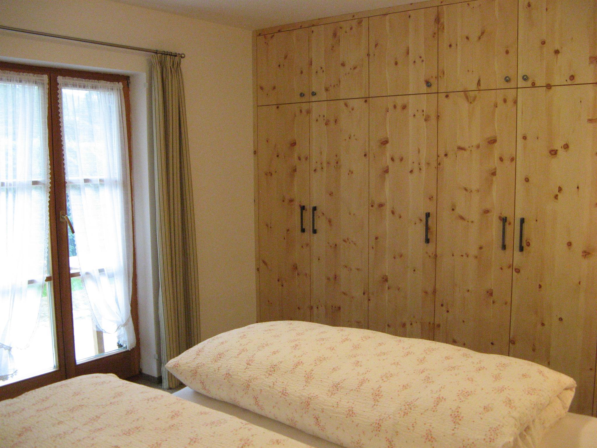 Im Anschluss geräumiges Schlafzimmer mit einem Doppelbett und Kleiderschrank aus Zirbenholz für tiefen Schlaf und Gesundheit, ebenfalls mit einer Terrassentüre.