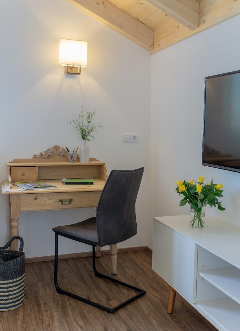 Die Ferienwohnung ist ist im alpinen Chic ausgestattet. Schlafzimmer aus massivem Zirbenholz, Küche mit Spülmaschine, Bad mit bodengleicher Dusche. Der große Wohnraum bietet einen sichtbaren Dachstuhl mit Südbalkon. TV und kostenloses WLAN vorhanden. Die Wohnung verfügt über einen separaten Eingang.