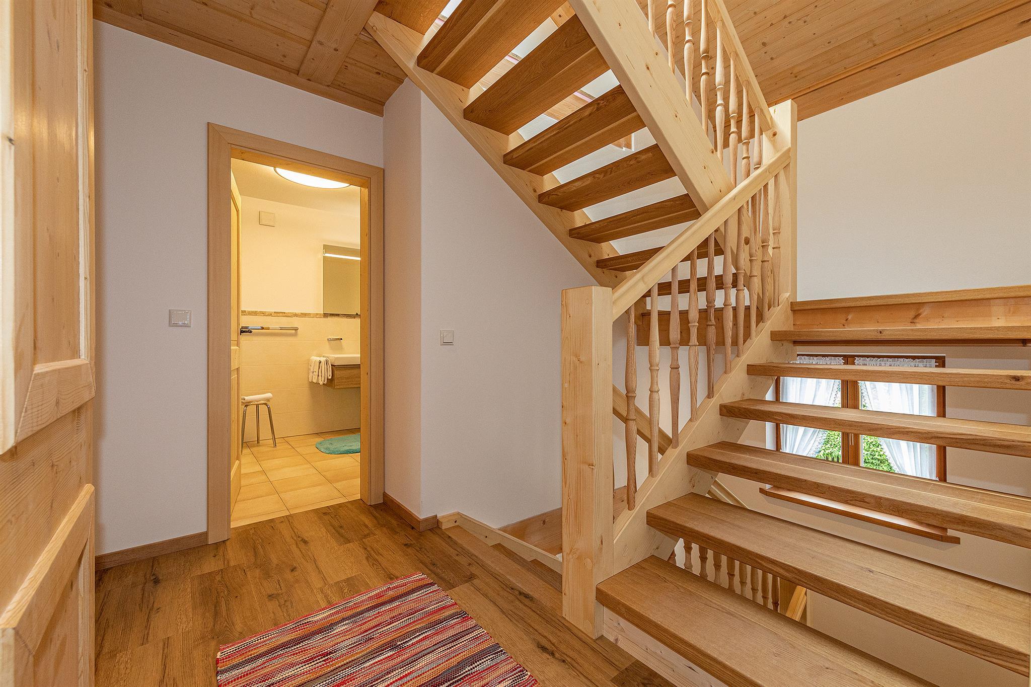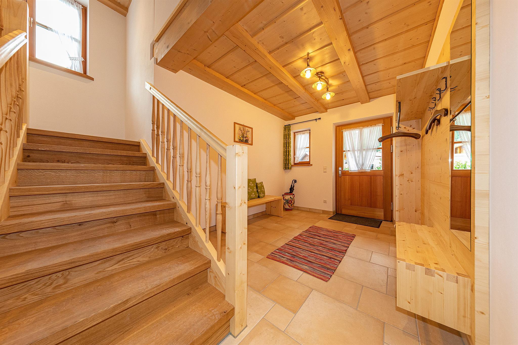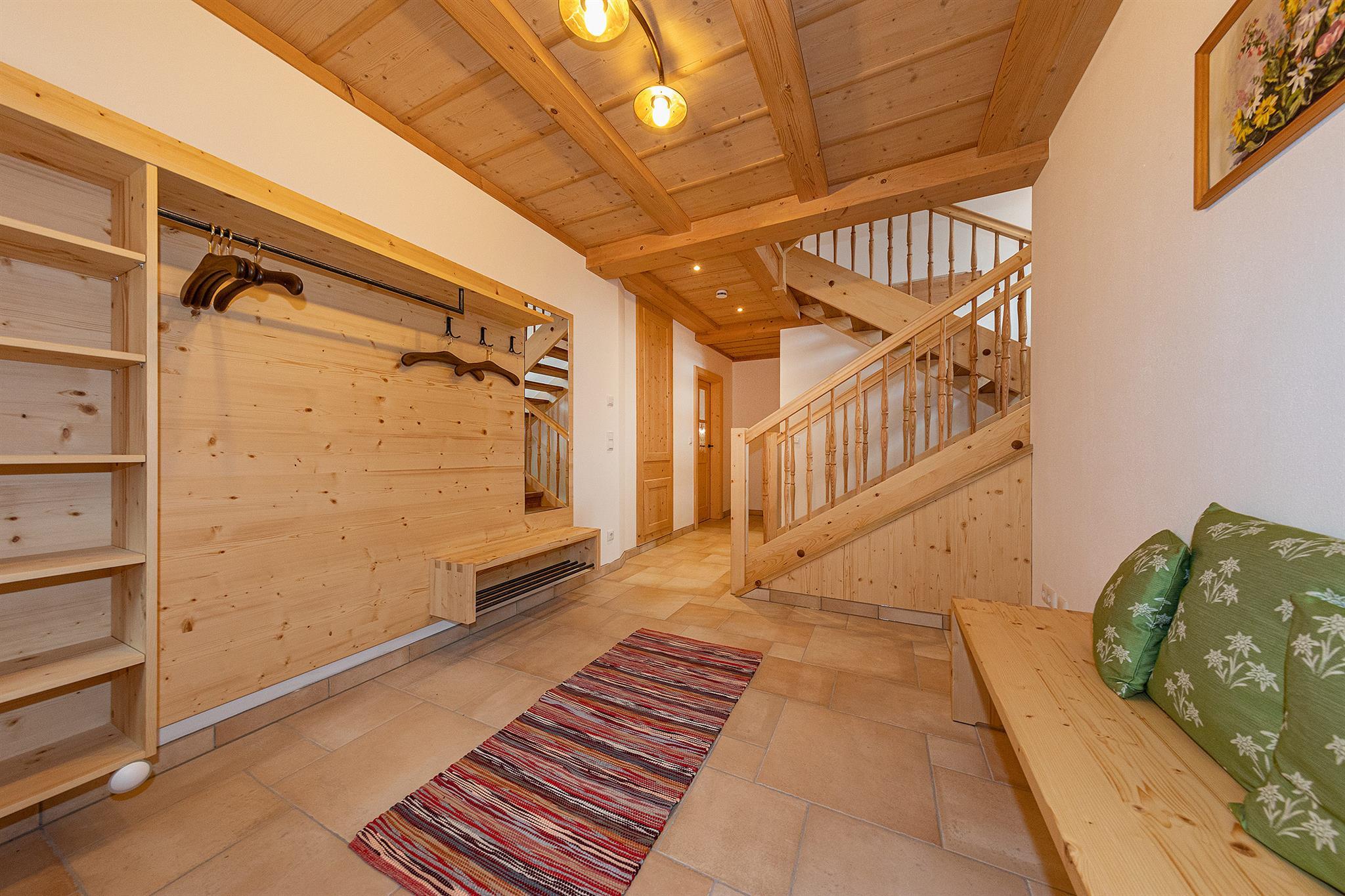 Um Ihren Aufenthalt so angenehm wie möglich zu gestalten, ist die Haushälfte 4erspitzblick   (Süd–Ost)  mit seinem Eingangsbereich /Flur mit einer Garderobe eingerichtet. Auch ein Tages –WC und Wirtschaftsfraum (WM +TR) befindet sich im EG. Die Komfort-Küche mit Essecke ist komplett eingerichtet und ausgestattet. Der Wohnbereich bietet mit Couchen und Sessel viel Platz für gemütliche Abende. Von beiden Räumen können Sie die möblierte Südterrasse betreten.  Im 1.OG finden Sie ihre drei Schlafzimmer welche aus Zirbenholz handgemacht sind. Von allen Schlafzimmern (2 Doppelschlafzimmer und einem Schlafzimmer mit Etagenbett (2 Betten 90x200 cm) haben Sie Zutritt auf die Balkone. Das großzügige Familienbad hat neben der ebenerdigen Relaxdusche , WC, BIDET, Handtuchwärmekörper und einen großen Waschtisch und Fön viel Platz für Sie. Für höchste Sauberkeit ist die gesamte Wohnung nur mit Holz- und Steinböden ausgestattet und somit für Allergiker geeignet.