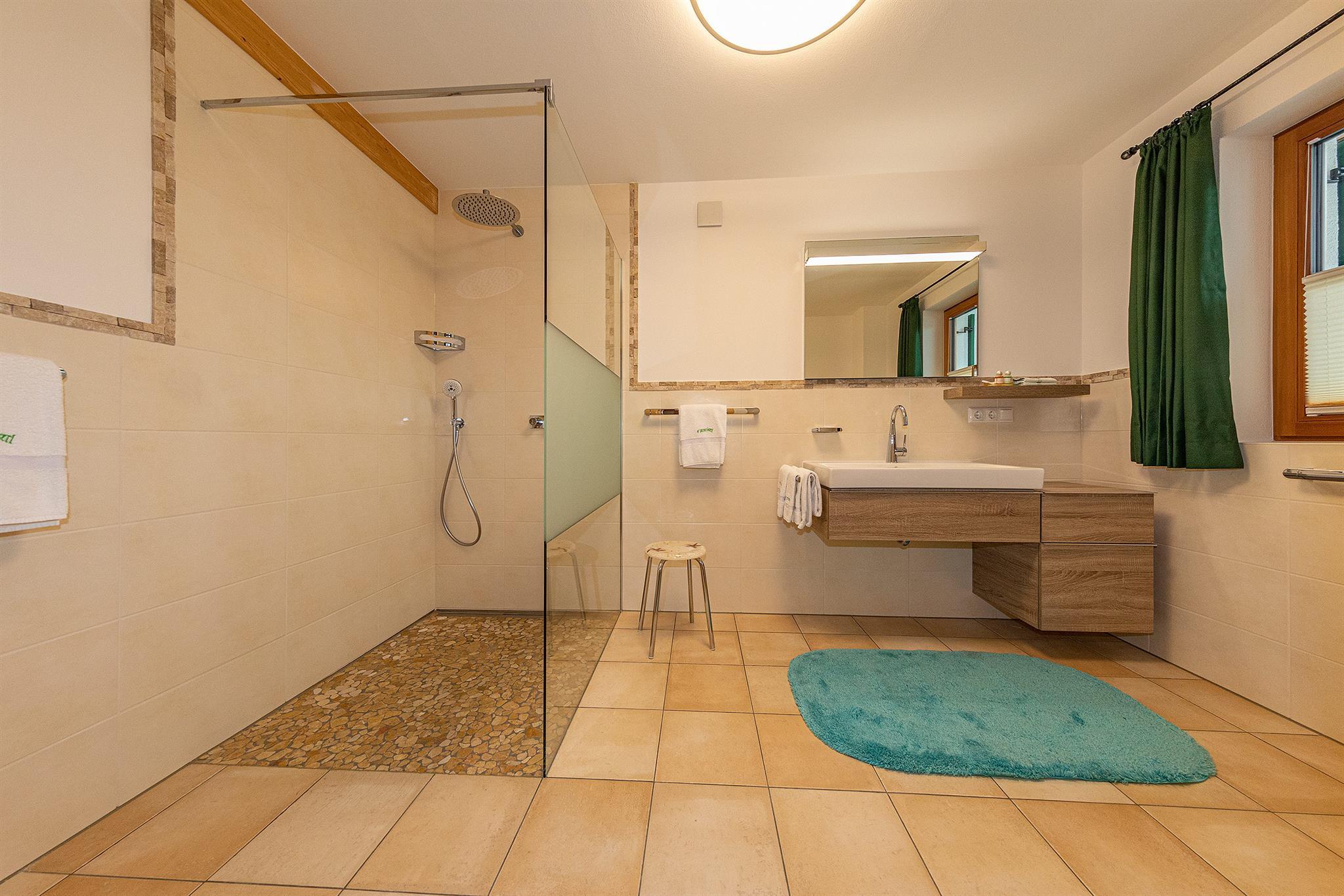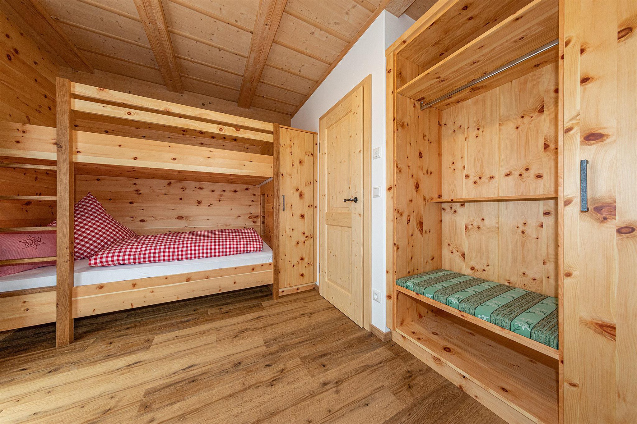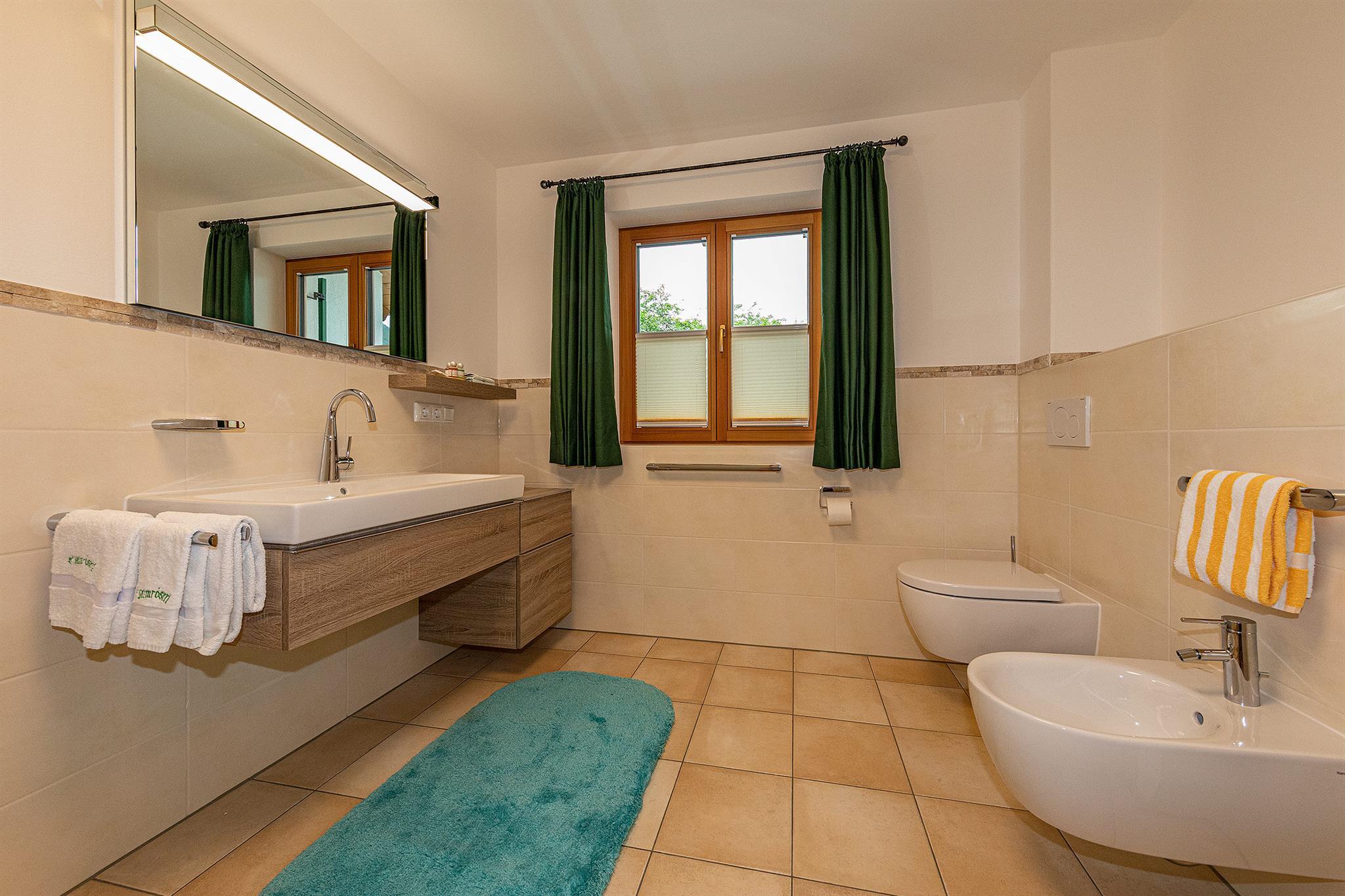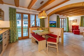 Um Ihren Aufenthalt so angenehm wie möglich zu gestalten, ist die Haushälfte 4erspitzblick   (Süd–Ost)  mit seinem Eingangsbereich /Flur mit einer Garderobe eingerichtet. Auch ein Tages –WC und Wirtschaftsfraum (WM +TR) befindet sich im EG. Die Komfort-Küche mit Essecke ist komplett eingerichtet und ausgestattet. Der Wohnbereich bietet mit Couchen und Sessel viel Platz für gemütliche Abende. Von beiden Räumen können Sie die möblierte Südterrasse betreten.  Im 1.OG finden Sie ihre drei Schlafzimmer welche aus Zirbenholz handgemacht sind. Von allen Schlafzimmern (2 Doppelschlafzimmer und einem Schlafzimmer mit Etagenbett (2 Betten 90x200 cm) haben Sie Zutritt auf die Balkone. Das großzügige Familienbad hat neben der ebenerdigen Relaxdusche , WC, BIDET, Handtuchwärmekörper und einen großen Waschtisch und Fön viel Platz für Sie. Für höchste Sauberkeit ist die gesamte Wohnung nur mit Holz- und Steinböden ausgestattet und somit für Allergiker geeignet.