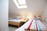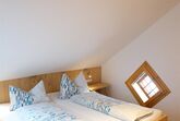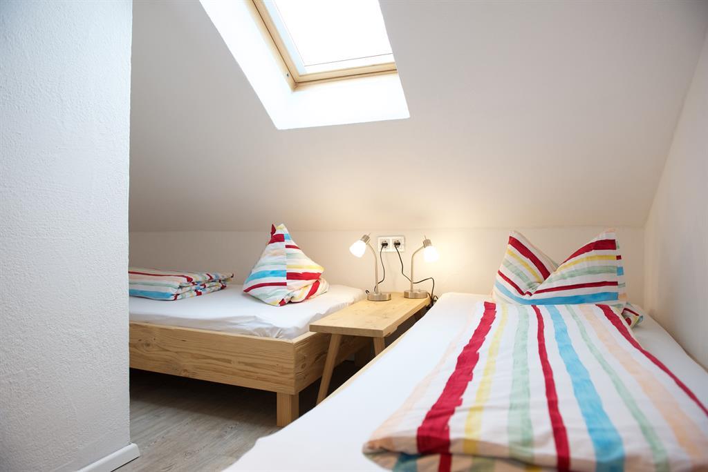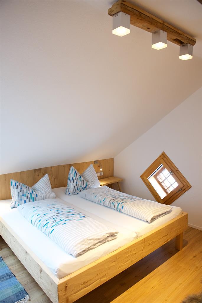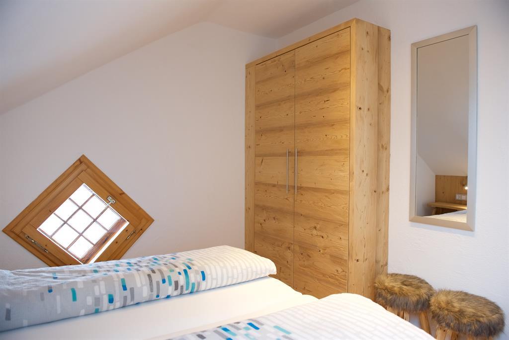 Durch das beliebte Heidifenster im Schlafzimmer mit Doppelbett können Sie den Sonnenaufgang beobachten und das Bergpanorama genießen. Im zweiten Schlafzimmer ist Platz für zwei Einzelbetten.
